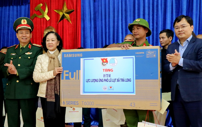 Trưởng Ban Dân vận Trung ương Trương Thị Mai và Bí thư thứ nhất Trung ương Đoàn Nguyễn Anh Tuấn trao tặng tivi cho lực lượng ứng phó lũ lụt xã Trà Leng