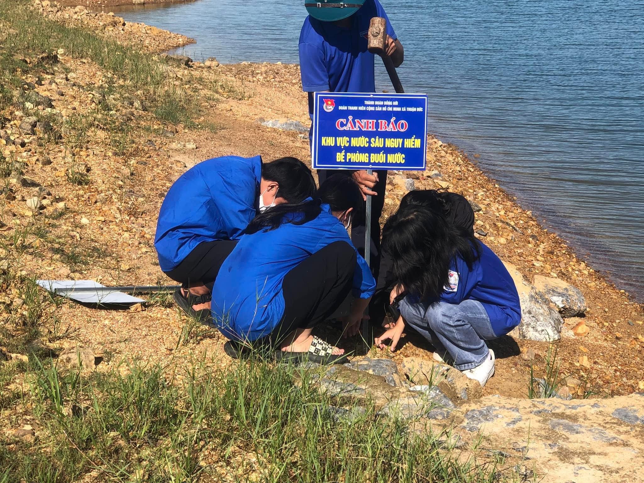 ĐVTN cắm biển cảnh báo nước sâu phòng chống đuối nước