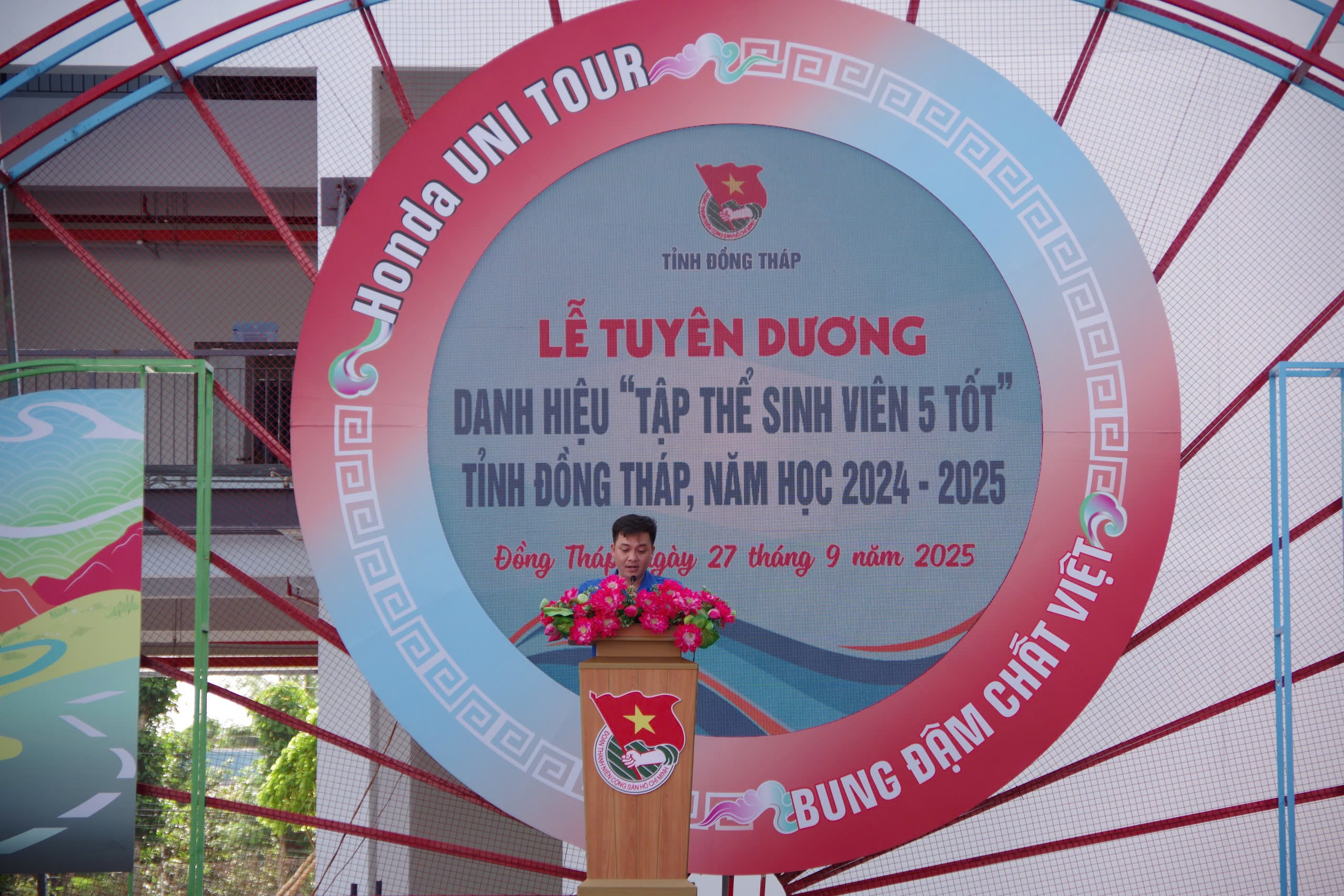 Phát biểu tại Lễ Tuyên dương, đồng chí Nguyễn Thành Luân - Phó Bí thư Tỉnh Đoàn, Chủ tịch Hội đồng Đội tỉnh Đồng Tháp chúc mừng, biểu dương thành tích xuất sắc của các tập thể, cá nhân. Đồng chí nhấn mạnh: “Các danh hiệu được trao tặng hôm nay là biểu tượng cao đẹp của tinh thần vượt khó, của trí tuệ và khát vọng vươn lên, khẳng định vai trò, trách nhiệm của tuổi trẻ Đồng Tháp trong học tập, lao động, nghiên cứu và cống hiến cho cộng đồng. Thành tích của các bạn không chỉ là niềm tự hào cá nhân mà còn là kết quả của sự đồng hành, hỗ trợ từ gia đình, nhà trường, tổ chức Đoàn – Đội và toàn xã hội”.