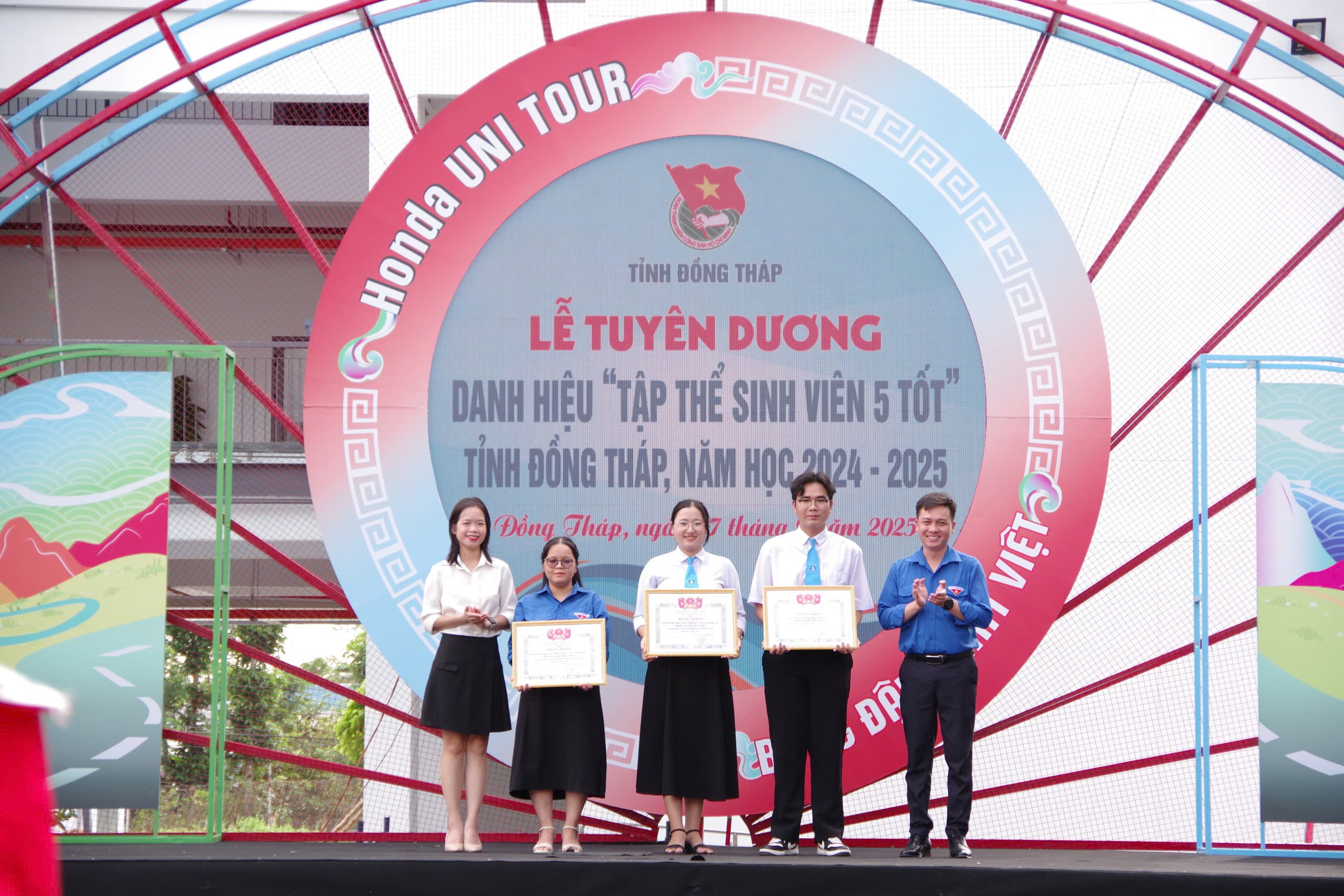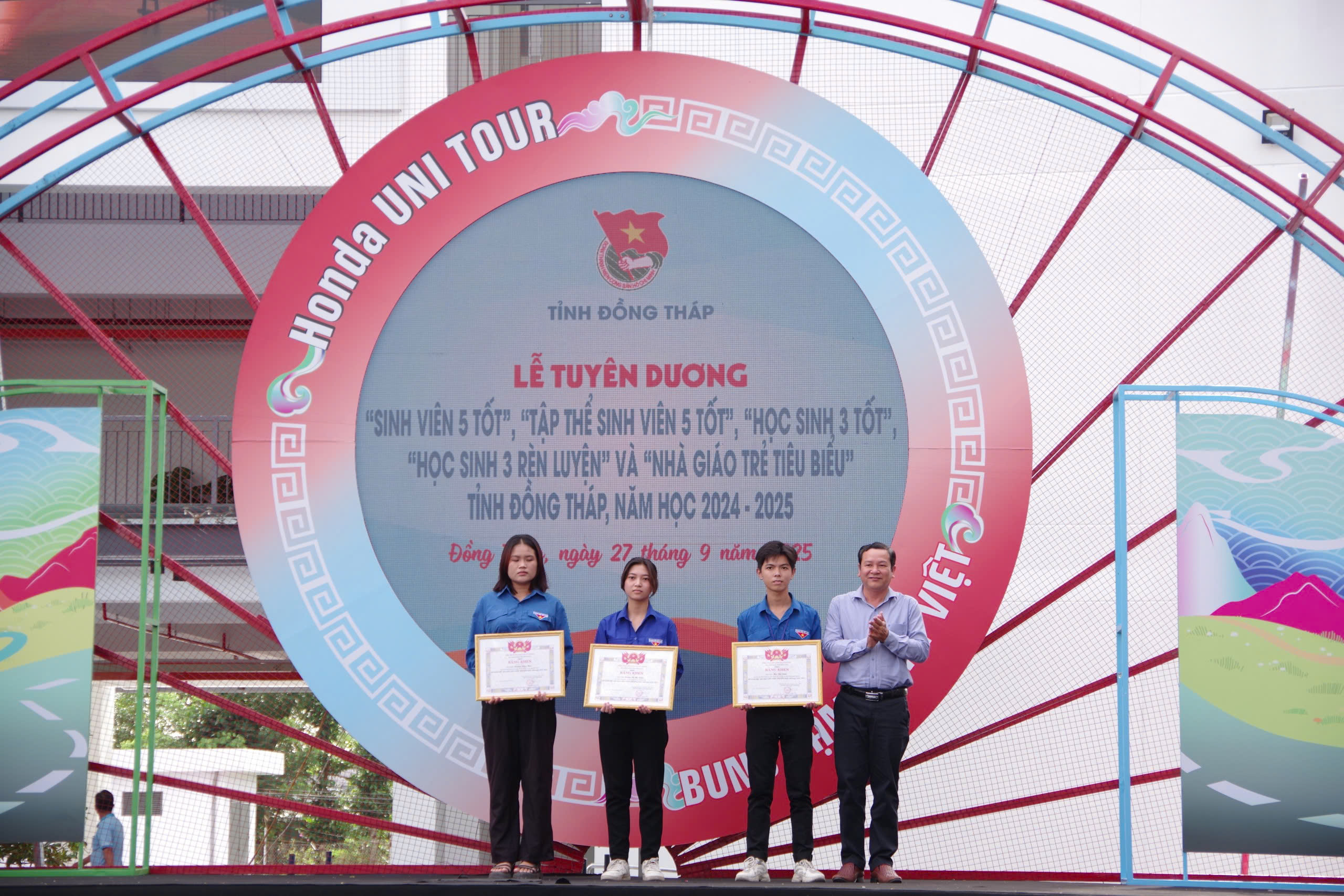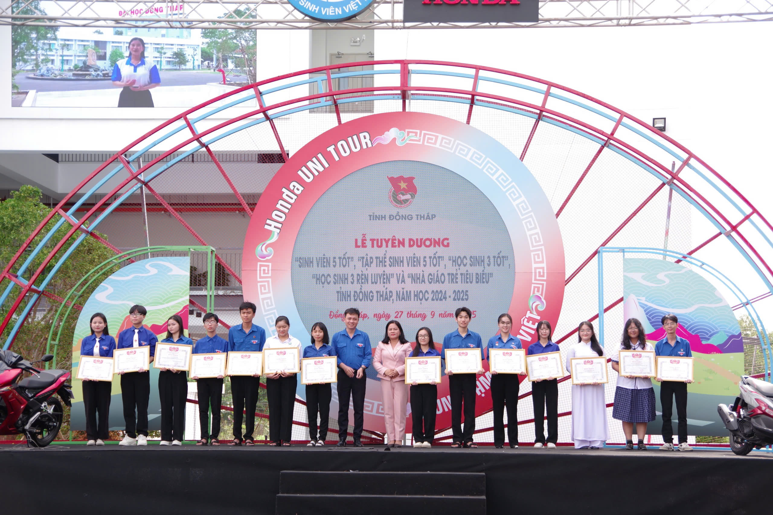 Tại buổi Lễ, Ban Tổ chức đã trao tặng bằng khen của Ban chấp hành Tỉnh đoàn cho 59 sinh viên đạt danh hiệu “Sinh viên 5 tốt”, 03 tập thể đạt danh hiệu “Tập thể sinh viên 5 tốt”, 32 học sinh đạt danh hiệu “Học sinh 3 tốt”, 03 học sinh đạt danh hiệu “Học sinh 3 rèn luyện” và 30 thầy, cô giáo trẻ được vinh danh “Nhà giáo trẻ tiêu biểu”. Đây là những gương mặt xuất sắc, hội tụ trí tuệ, nghị lực và tinh thần trách nhiệm, góp phần làm rạng danh phong trào “Dạy tốt – Học tốt”, thúc đẩy đổi mới sáng tạo trong học đường, đồng thời lan tỏa tinh thần xung kích, tình nguyện, cống hiến của tuổi trẻ Đồng Tháp.