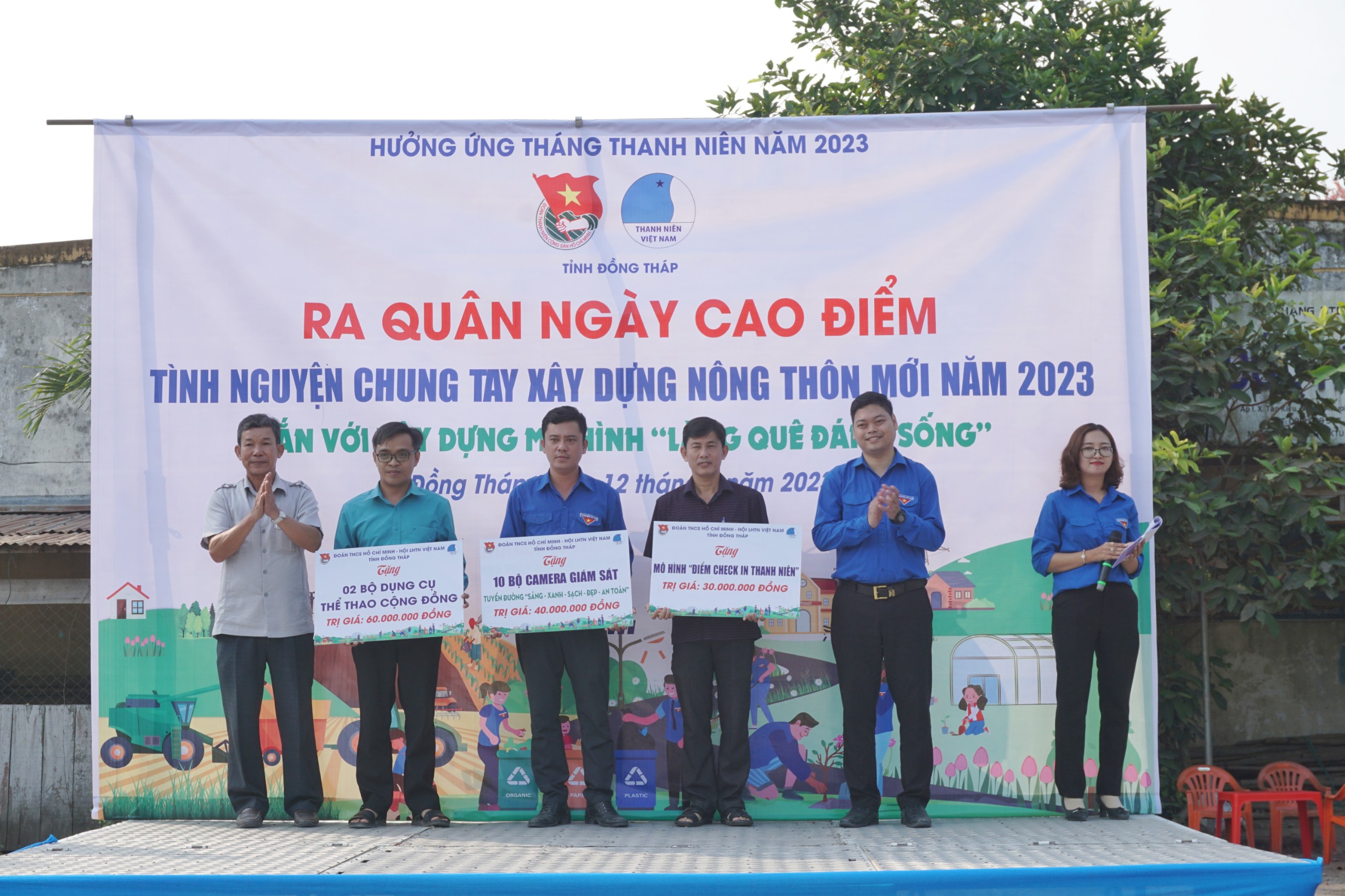Nhằm triển khai việc hỗ trợ Ấp 1, xã Tân Kiều xây dựng mô hình “Làng quê đáng sống” được Trung ương Đoàn chọn làm 01 trong 03 điểm của cả nước, Ban Thường vụ Tỉnh đoàn đã trao tặng các công trình, mô hình cho Huyện đoàn Tháp Mười và xã Tân Kiều các nội dung: trao tặng 03 km “Hàng cây Thanh niên” trị giá 75 triệu đồng nhằm đồng hành cùng địa phương trong việc nâng cao chất lượng và độ che phủ của cây xanh trong việc bảo vệ môi trường sinh thái, cải thiện cảnh quan và ứng phó với biến đổi khí hậu. Bên cạnh đó, Ban Thường vụ Tỉnh đoàn trao tặng 400 sọt phân loại rác và chế phẩm sinh học cho 200 hộ gia đình trị giá 45 triệu đồng; Tặng 30 sọt rác triển khai “Cụm dân cư xanh – sạch – đẹp” trị giá 20 triệu đồng; Trao tặng mô hình “Điểm check-in thanh niên” trị giá 30 triệu đồng; Tặng 02 bộ dụng cụ thể thao cộng đồng trị giá 60 triệu đồng; Trao 10 bộ camera giám sát để xây dựng mô hình “Tuyến đường sáng – xanh – sạch – đẹp – an toàn” trị giá 40 triệu đồng và trao tặng 01 công trình thanh niên “Du lịch với QR thanh niên” trị giá 7,5 triệu đồng nhằm giúp các địa phương nâng cao chất lượng các tiêu chí xây dựng nông thôn mới, nông thôn mới nâng cao và nông thôn mới kiểu mẫu. Tổng trị giá các nguồn lực trao tặng và hỗ trợ trong buổi Lễ là gần 300 triệu đồng.