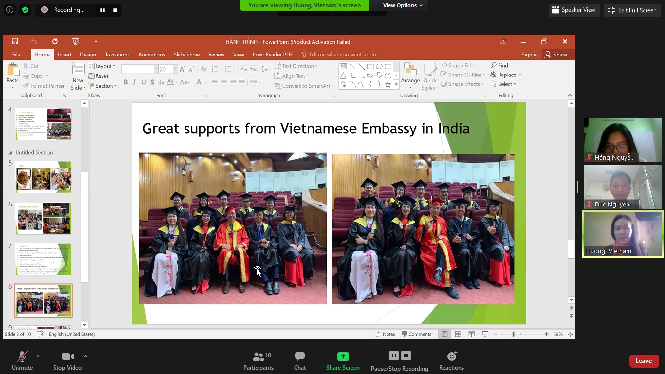 Qua trao đổi, thảo luận từ các thành viên, webinar đã bao quát hầu hết những thuận lợi, khó khăn, thách thức mà chúng ta những du học sinh đang trải qua. Mọi người đã thống nhất chung khó khăn lớn nhất mà du học sinh gặp phải do tác động sâu sắc của đại dịch COVID-19 đã làm gián đoạn, ảnh hưởng nghiêm trọng đến việc nghiên cứu và học tập. Điều này khiến nhiều du học sinh Việt Nam phải chuyển sang hình thức học online và gia hạn chương trình học của mình. Qua Webinar này, du học sinh Việt Nam tại Ấn Độ đề xuất cơ quan cấp học bổng cho du học sinh Việt Nam như ICCR, Chính phủ Ấn Độ tiếp tục hỗ trợ gia hạn, cấp học bổng cho du học sinh Việt Nam để các bạn có thể hoàn thành, kết thúc chương trình học một cách tốt nhất và trọn vẹn nhất.