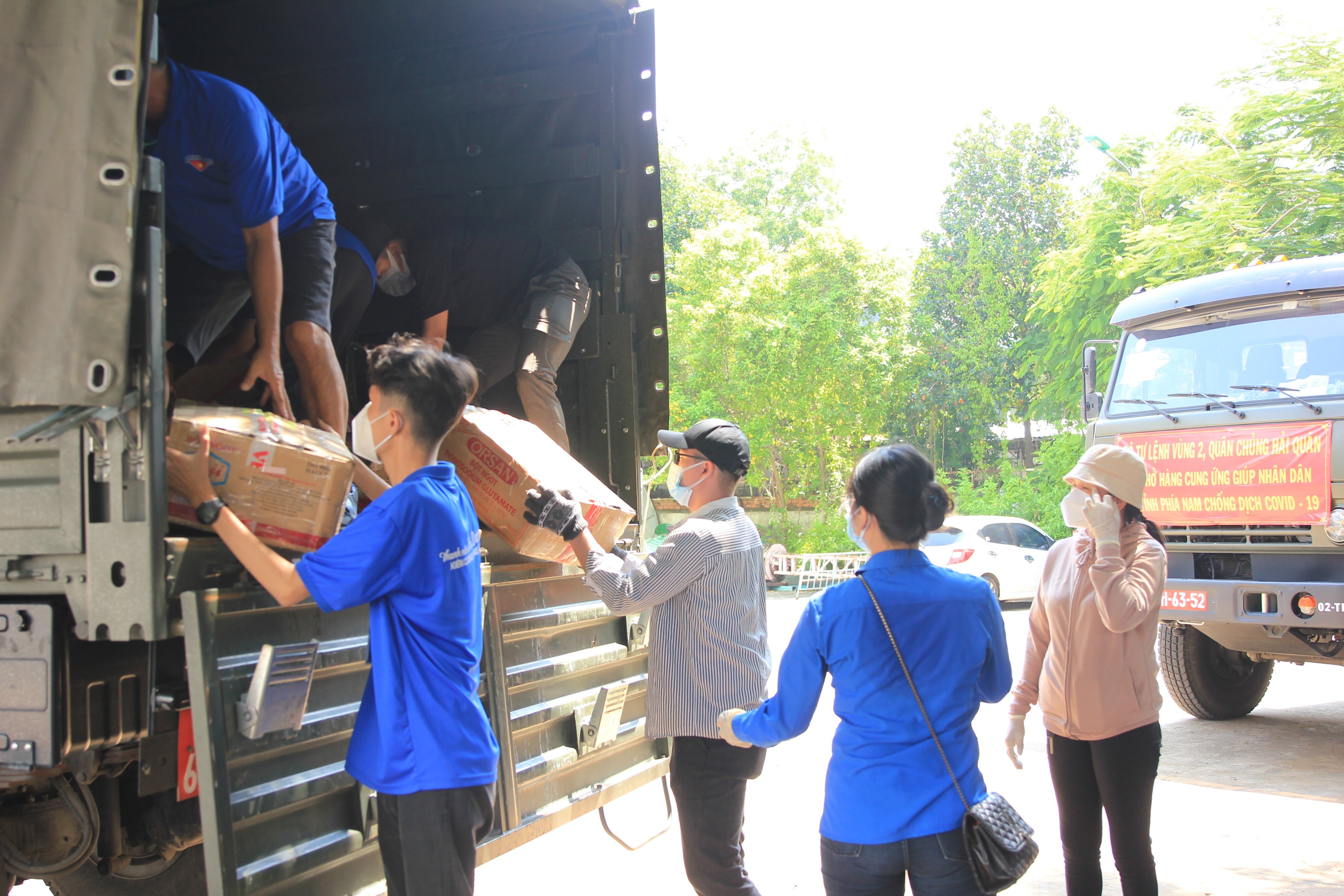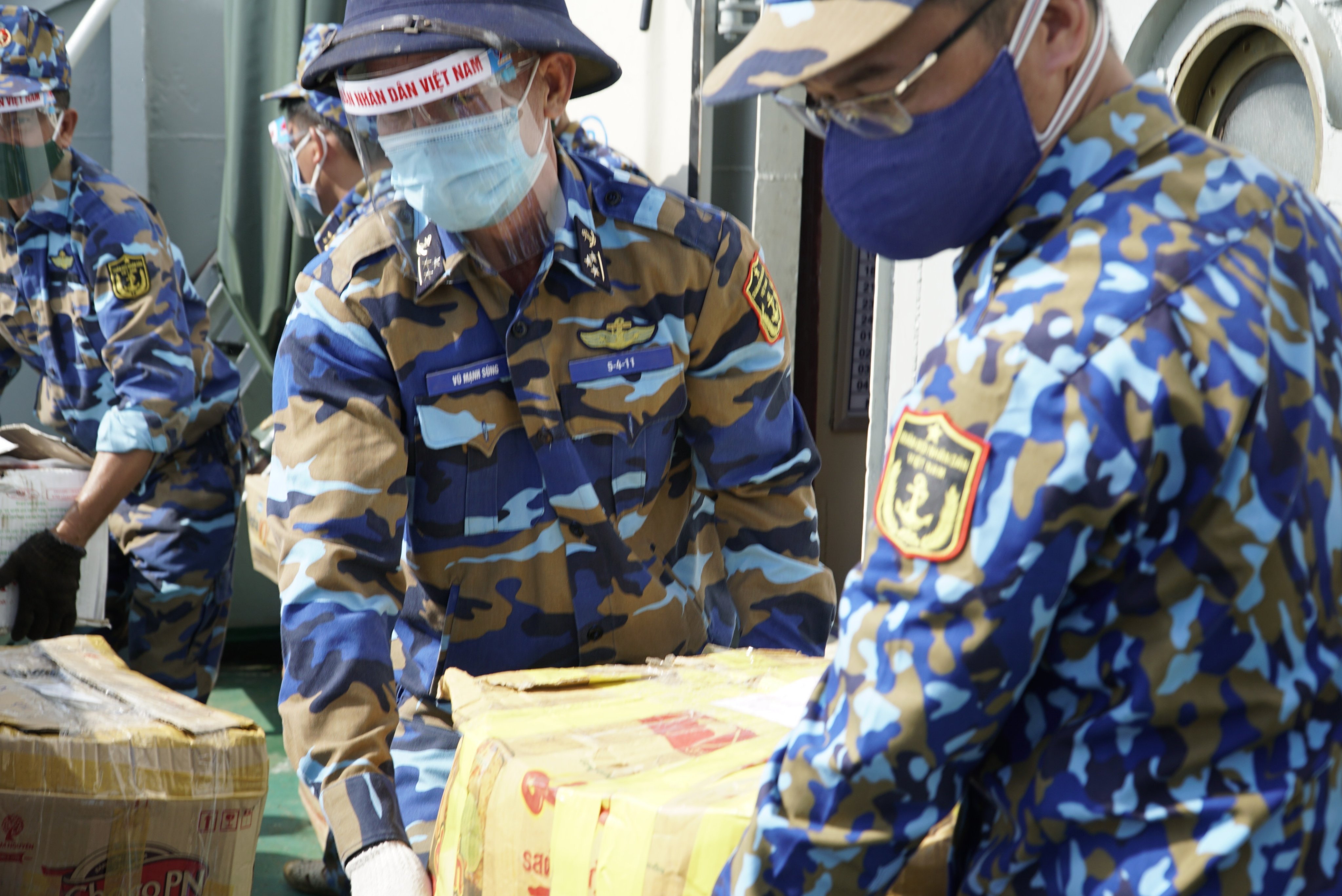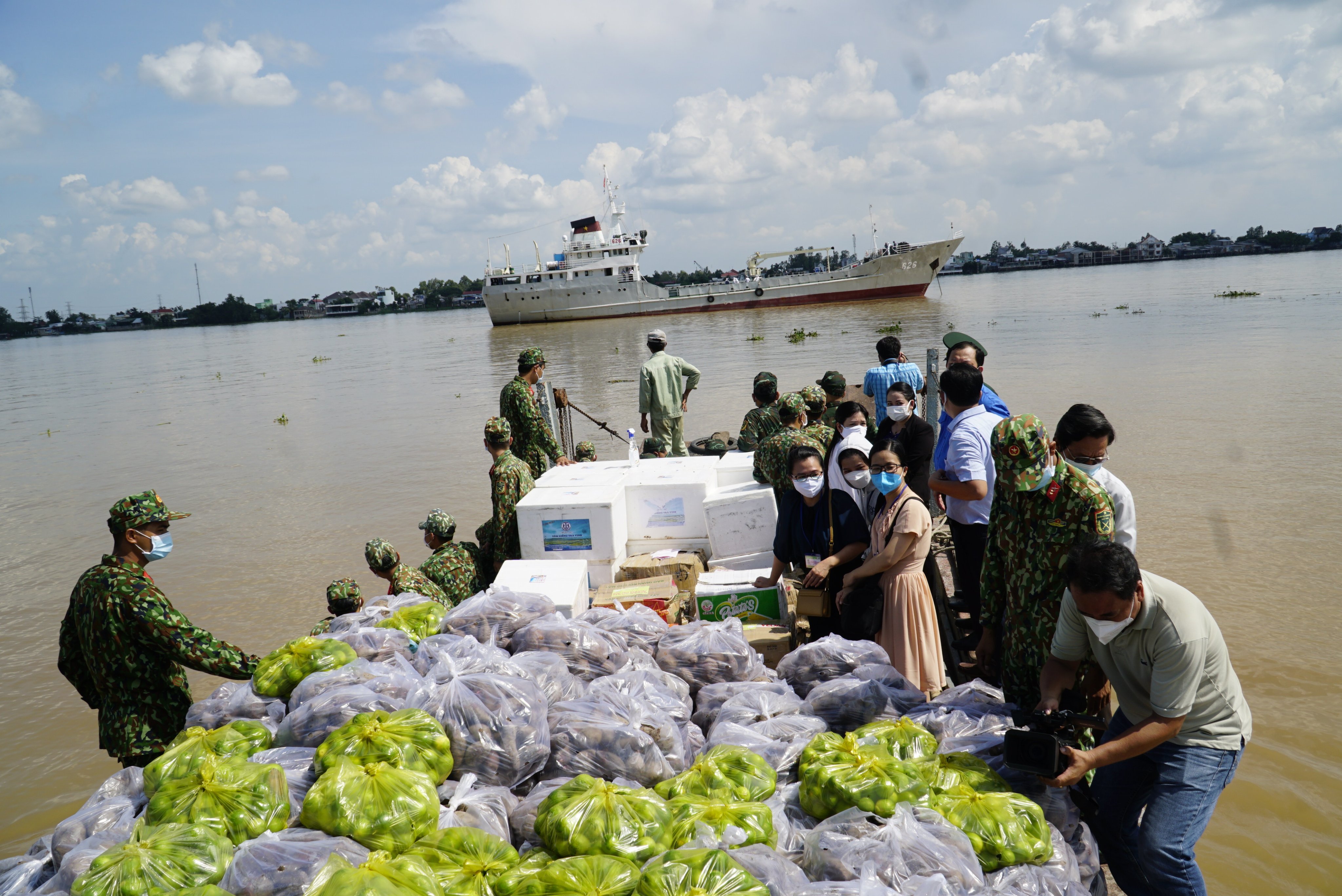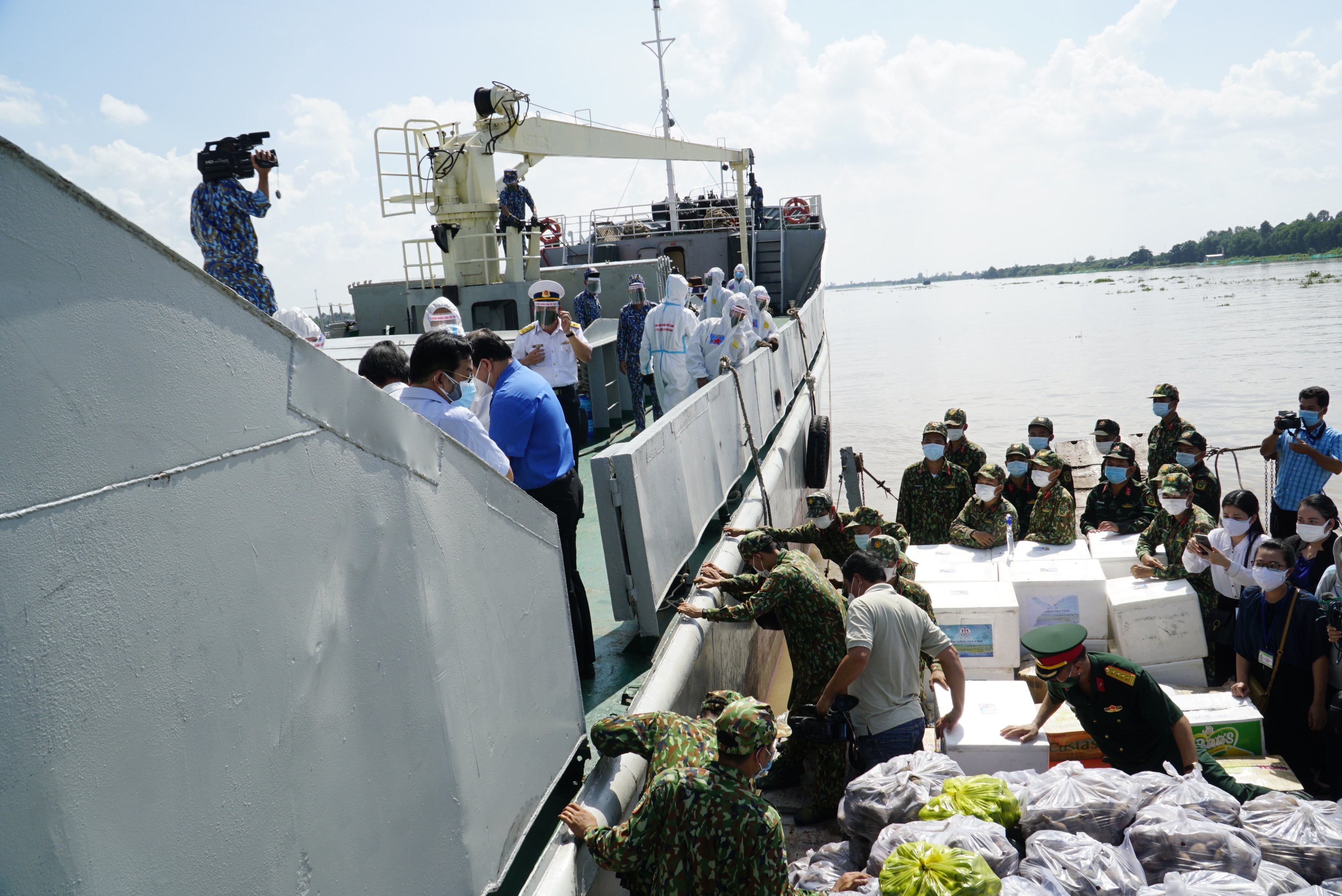 Trước đó, gần 30 tấn nông sản gồm gạo, khoai lang, chanh, bắp được các chiến sĩ vùng 2 Hải quân vận chuyển bằng đường thuỷ từ Đồng Tháp về cảng Cát Lái (TP. HCM).