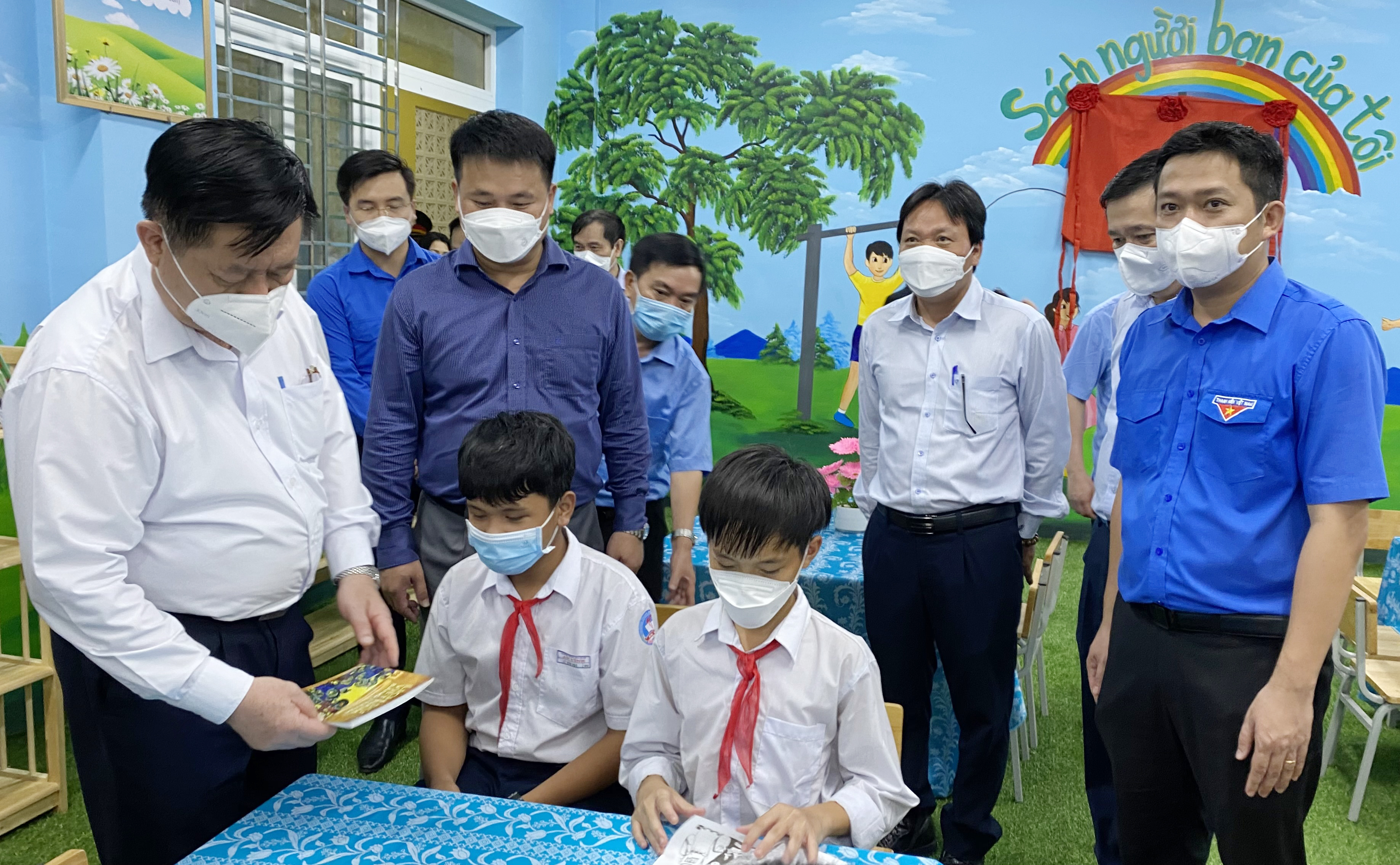 Bí thư Trung ương Đảng, Trưởng ban Tuyên giáo Trung ương Nguyễn Trọng Nghĩa dành thời gian trò chuyện và động viên các cháu học sinh Trường THCS An Vĩnh