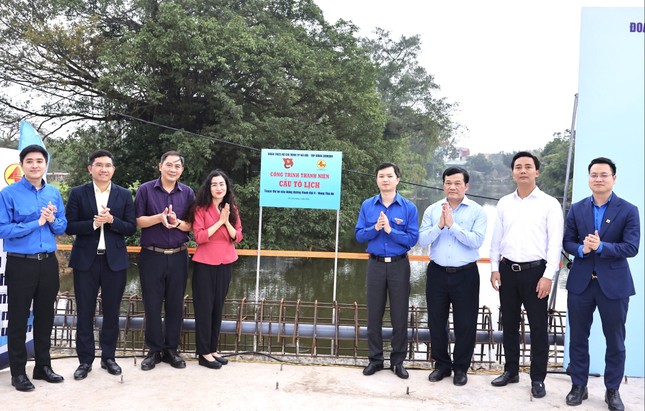 Gắn biển "Công trình thanh niên xây dựng cầu Tô Lịch thuộc Dự án xây dựng đường Vành đai 4 - Vùng Thủ đô”.