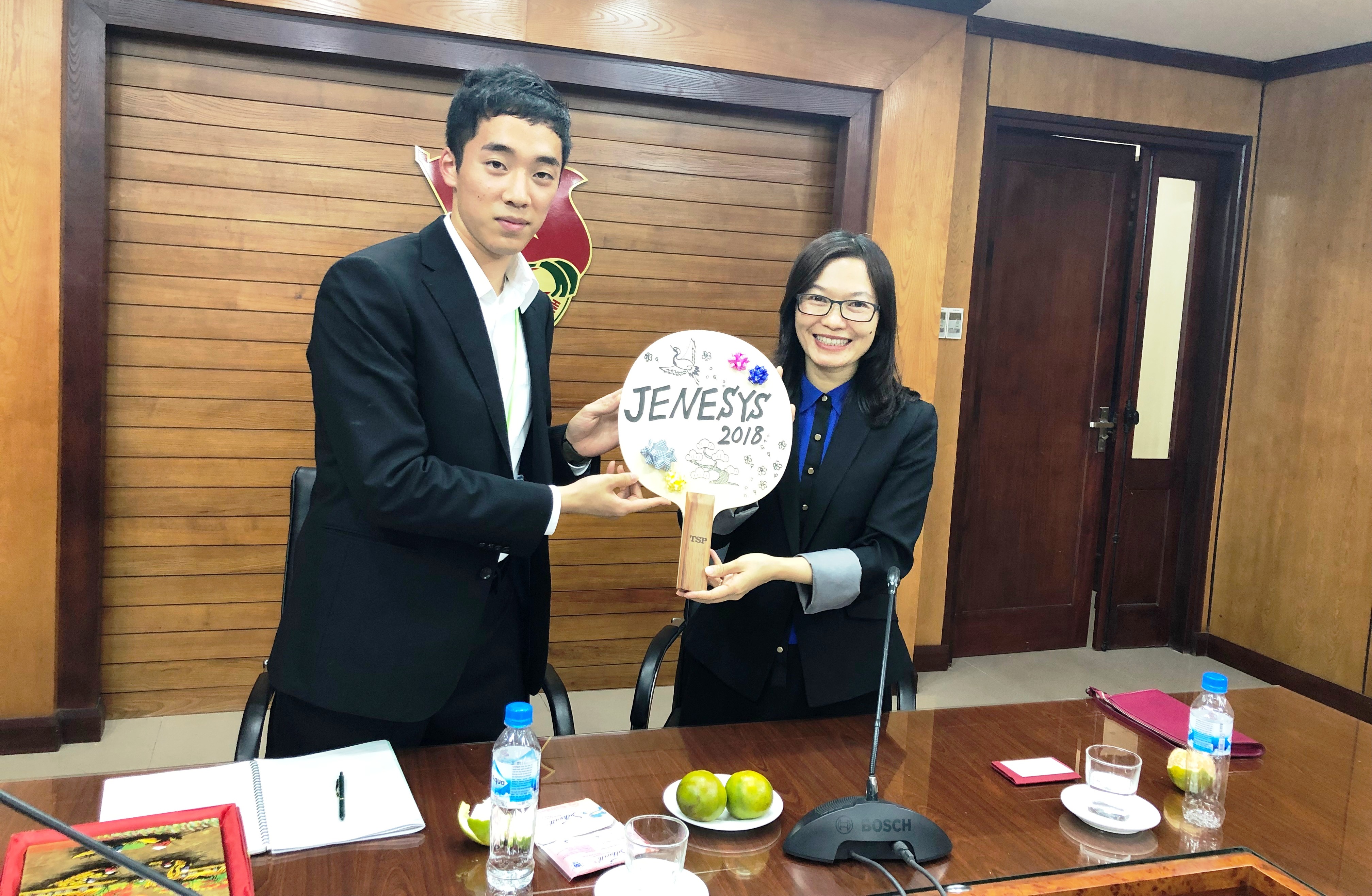 Đại diện đoàn sinh viên Nhật Bản tặng mô hình chiếc vợt bóng bàn gồm 21 chữ ký của các thành viên trong đoàn |