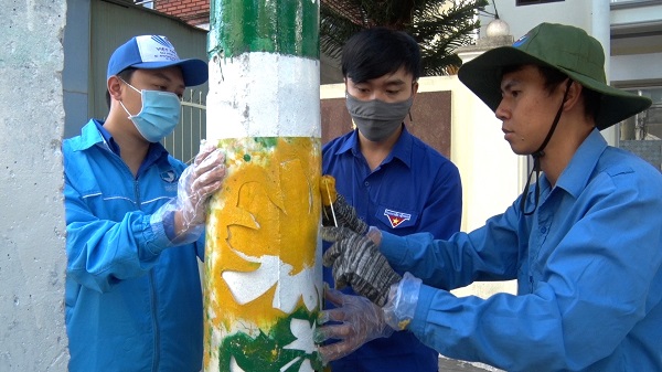 Lực lượng ĐVTN ra quân sơn vẽ các trụ điện trên đường phố
