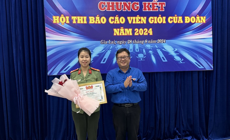 Anh Nguyễn Chí Hiếu- Phó Bí thư Tỉnh đoàn trao giải Nhất cho thí sinh Phan Thị Thuận- đoàn viên Đoàn cơ sở Công an huyện Chư Păh