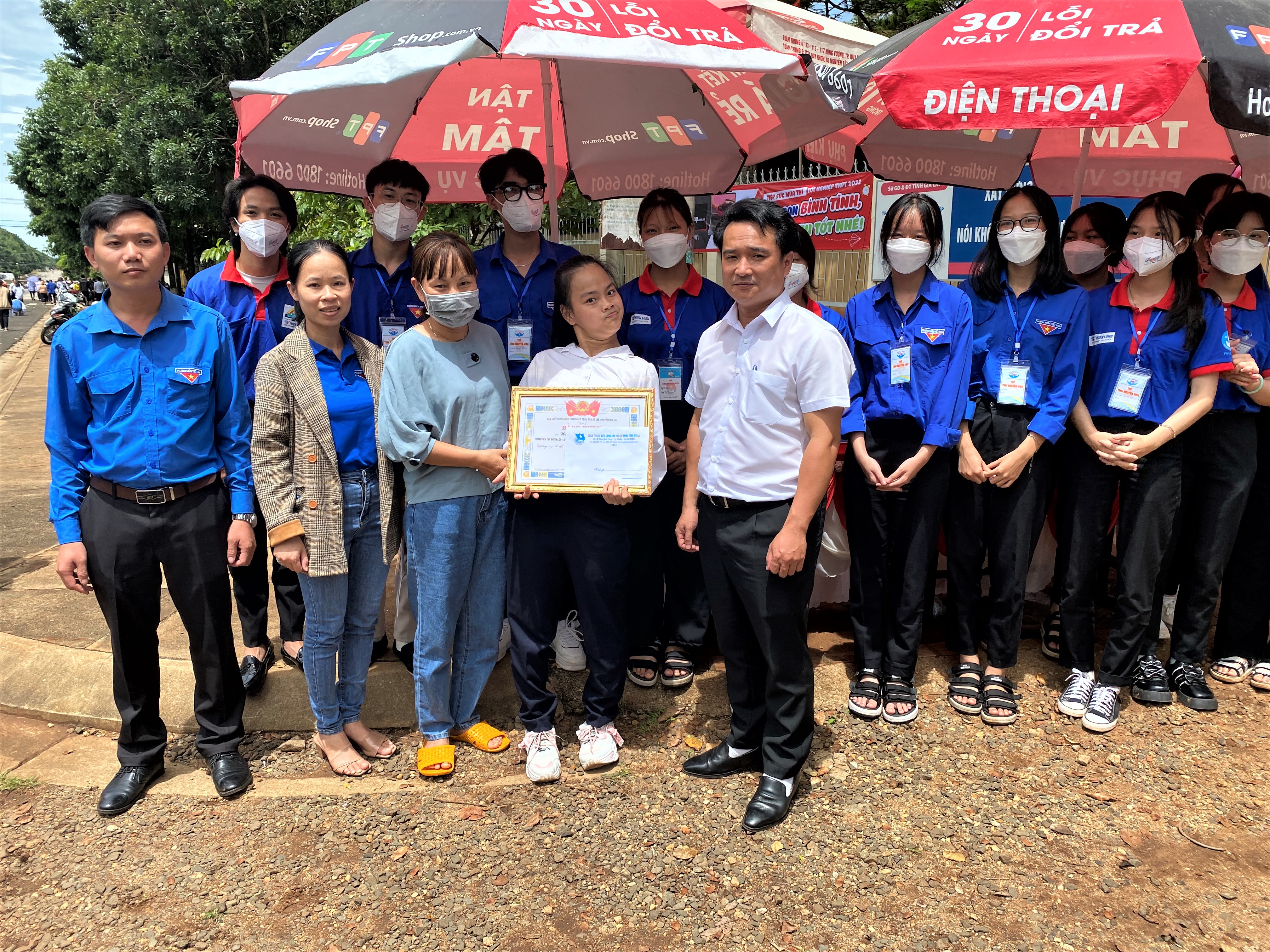 Anh Đỗ Duy Nam tặng bằng khen của tỉnh đoàn cho em Hoàng Thị Anh Thư