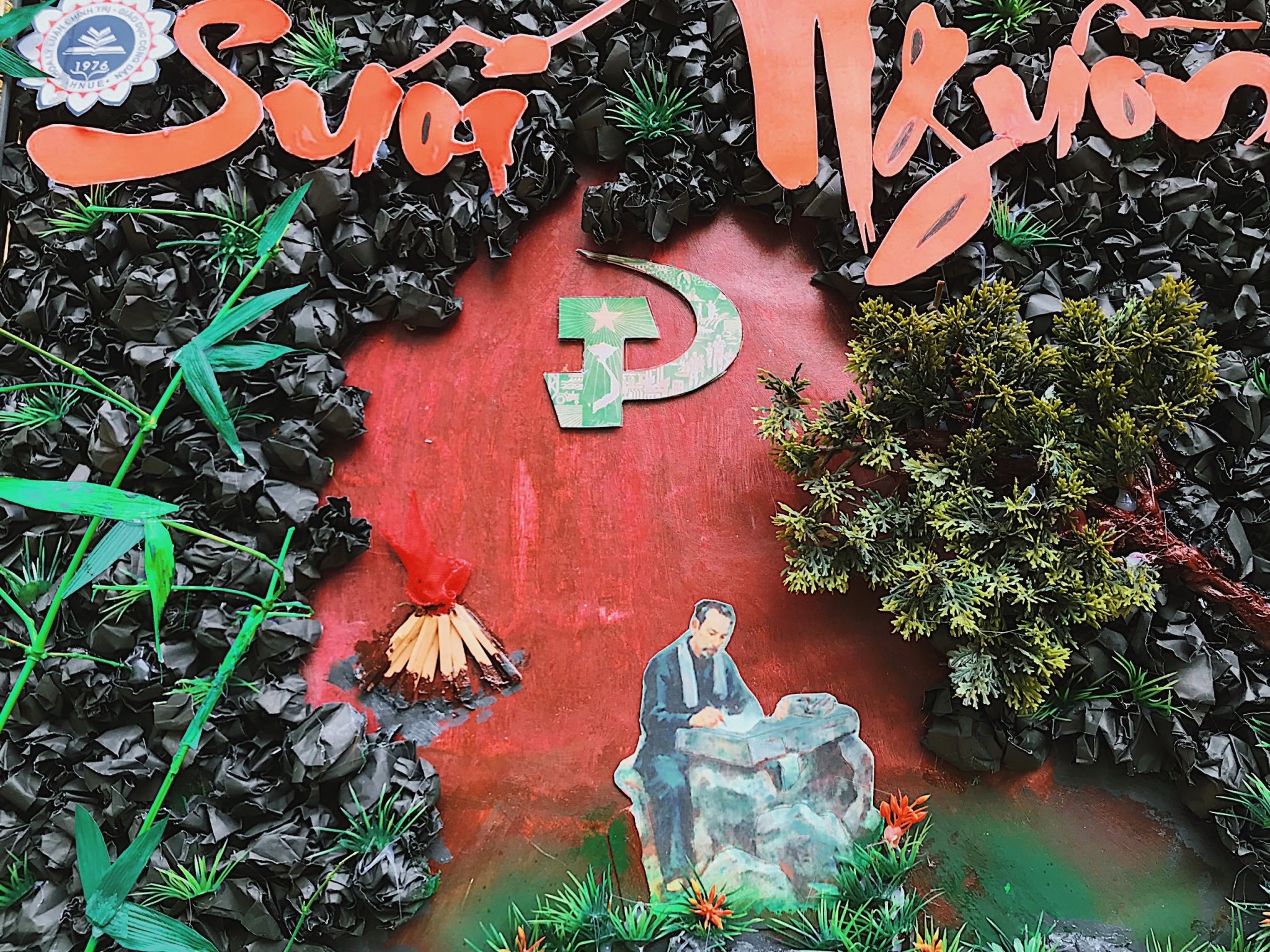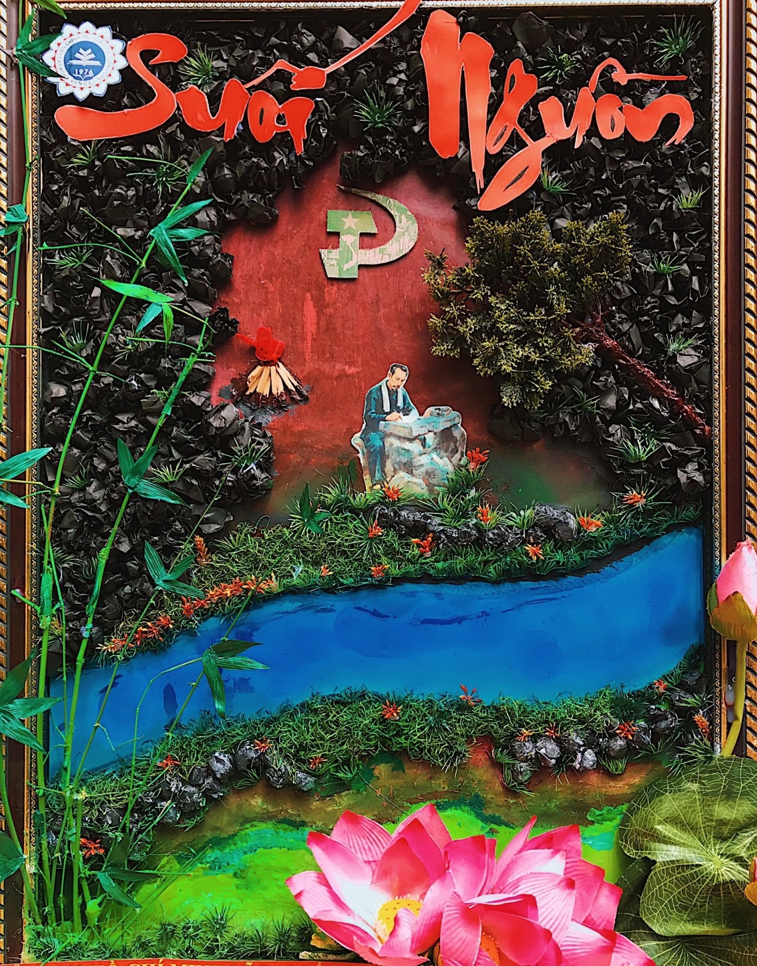 Việc giáo dục lý luận chính trị cho sinh viên, học sinh trong hệ thống giáo dục quốc dân là rất cần thiết và quan trọng. Với tinh thần nhiệt huyết, sáng tạo của tuổi trẻ, nhóm sinh viên khoa LLCT - GDCD, trường ĐHSP Hà Nội gồm: Nguyễn Ngọc Yến, Lê Văn Kiên, Nguyễn Hữu Quyết, Hoàng Thị Bích Phương, Nguyễn Thị Bình, Chu Thị Tài Linh, Nguyễn Quang Khuê,… đã nghiên cứu, tìm hiểu và sáng tạo, thiết kế ra tác phẩm “Suối nguồn” với nguyên liệu chủ đạo bằng giấy, kết hợp hài hòa, phòng phú của màu sắc và các chi tiết phụ để tạo nên giá trị của tác phẩm.