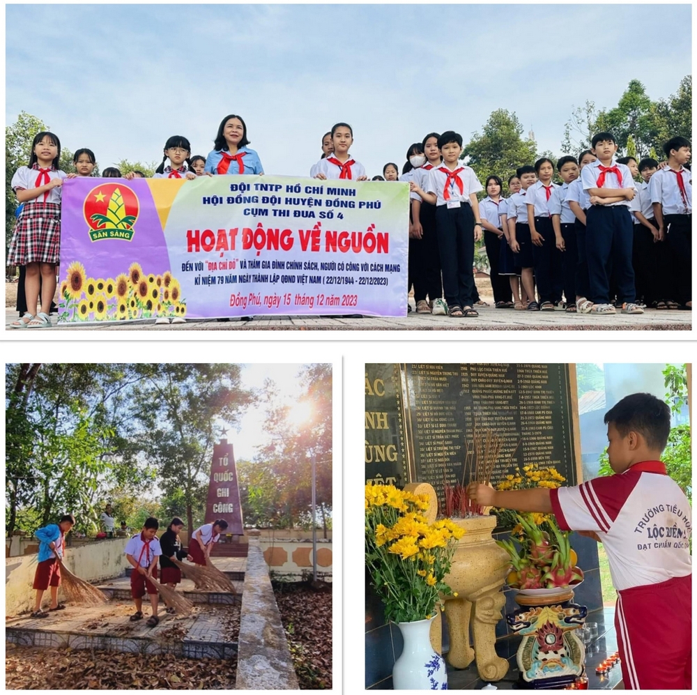 Tại huyện Đồng Phú, 100 đội viên tiêu biểu đại diện cho toàn thể các em đội viên của 7 liên đội trong Cụm thi đua số 4, Hội đồng Đội huyện Đồng Phú đã có một chuyến về nguồn đến với “địa chỉ đỏ” ý nghĩa. Các em đã cùng nhau dâng hương tại Nhà bia tưởng niệm huyện Đồng Phú, vệ sinh khuôn viên khu tưởng niệm, ôn lại truyền thống vẻ vang của Quân đội nhân dân Việt Nam. Ngoài ra, các em còn được đến thăm, tặng quà các gia đình chính sách có công với cách mạng đang sinh sống trên địa bàn huyện.