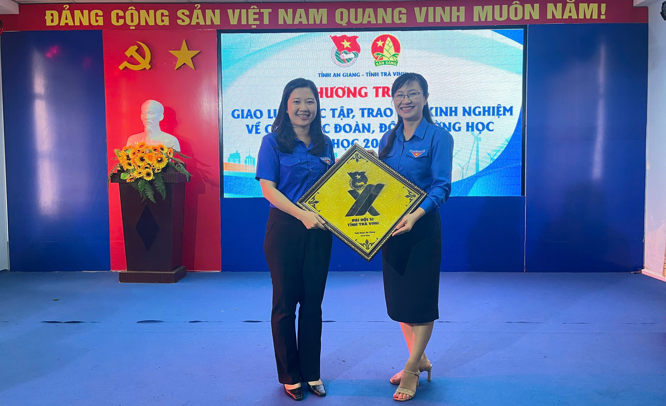 Đồng chí Hồ Thị Hồng Phướng, Phó Bí thư Tỉnh đoàn, Chủ tịch Hội đồng Đội tỉnh An Giang tặng quà lưu niệm Tỉnh đoàn Trà Vinh