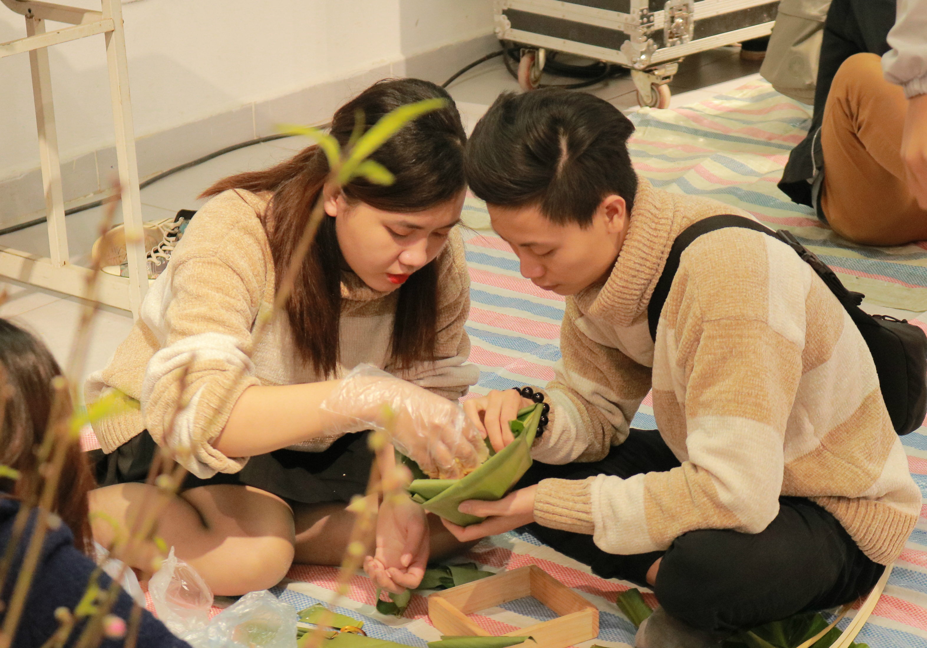 Bên cạnh đó, các bạn trẻ cũng hào hứng tham gia các phần thi gói bánh chưng, trang trí cành đào, viết câu đối...