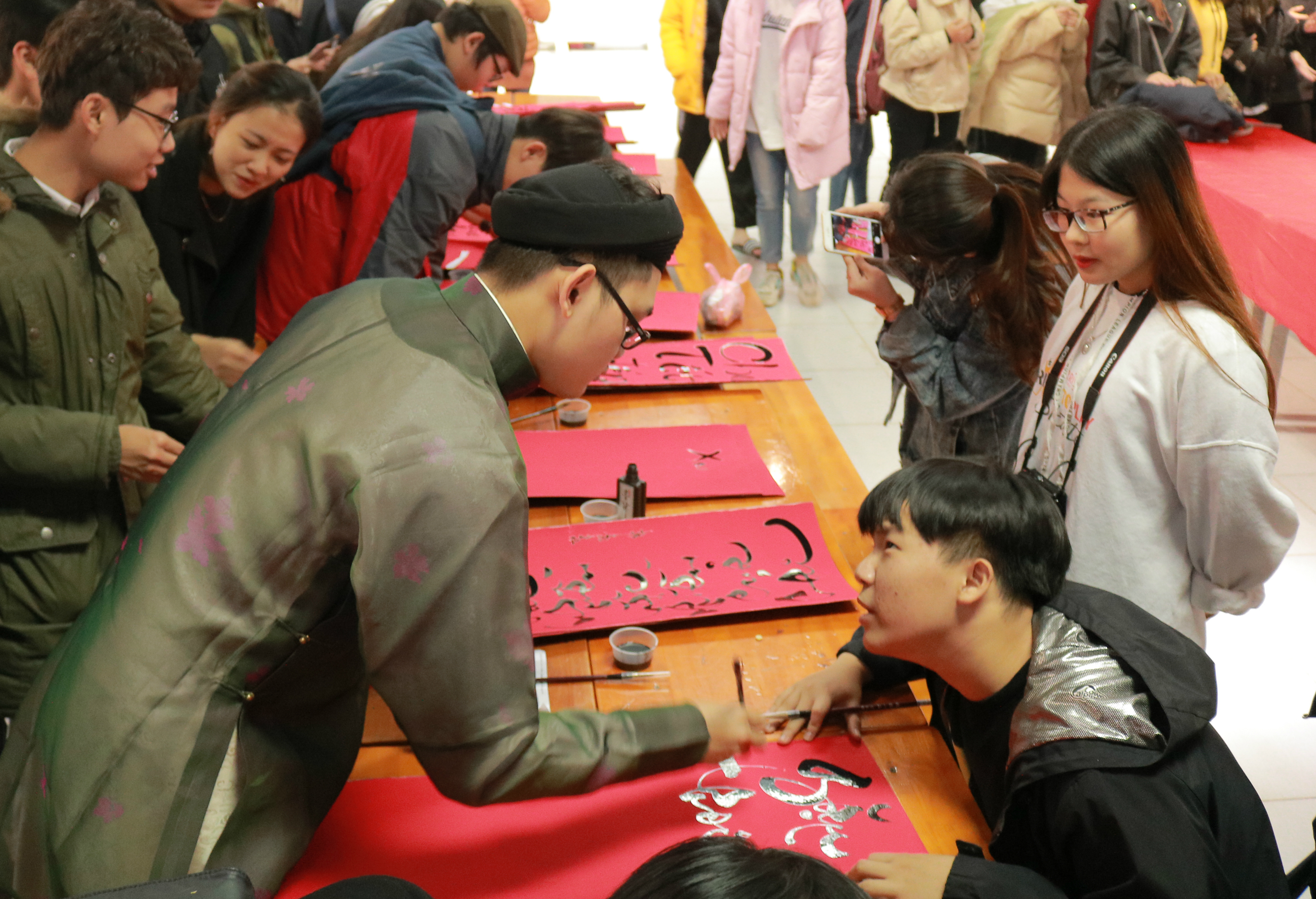 Góc câu đối của những ông đồ trẻ cũng đã thu hút đông đảo sinh viên tới xin chữ |