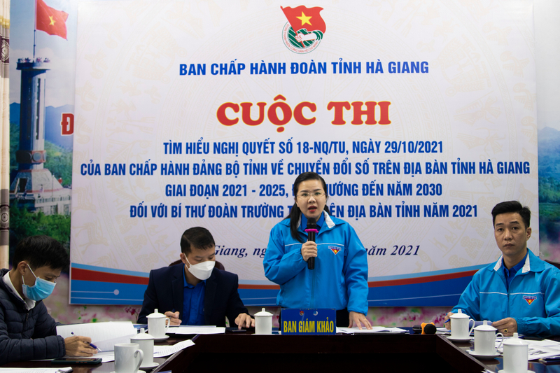 Tại điểm cầu cấp tỉnh, đồng chí Đỗ Thị Hương - Bí thư Tỉnh đoàn - Trưởng Ban Giám khảo phát biểu khai mạc cuộc thi nhấn mạnh: "Cái khó nhất trong chuyển đổi số là phải thay đổi thói quen, thay đổi nhận thức của mỗi người để sẵn sàng tiếp cận với những cái mới, cách làm mới. Do vậy, trong quá trình thực hiện chuyển đổi số, không thể thiếu lực lượng nòng cốt là các đồng chí Bí thư đoàn các trường THPT trong toàn tỉnh – họ là những người trẻ tuổi trình độ cao, tràn đầy nhiệt huyết, tầng lớp tri thức của tuổi trẻ tỉnh nhà, những người sẽ đi đầu, chỉ đường, hướng dẫn cho lực lượng đoàn viên bằng tinh thần dám nghĩ, dám làm, xung kích đi đầu tiếp cận cái mới, chắc chắn tuổi trẻ Hà Giang sẽ góp phần đắc lực đưa Nghị quyết đi vào cuộc sống".