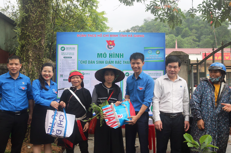 Đồng chí Vũ Minh Thảo - Uỷ viên BCH, Phó Ban Thanh niên Nông thôn Trung ương Đoàn và đồng chí Đỗ Thị Hương - UV BCH T.Ư Đoàn, Bí thư Tỉnh đoàn Hà Giang tặng túi nhựa tái chế cho bà con nhân dân