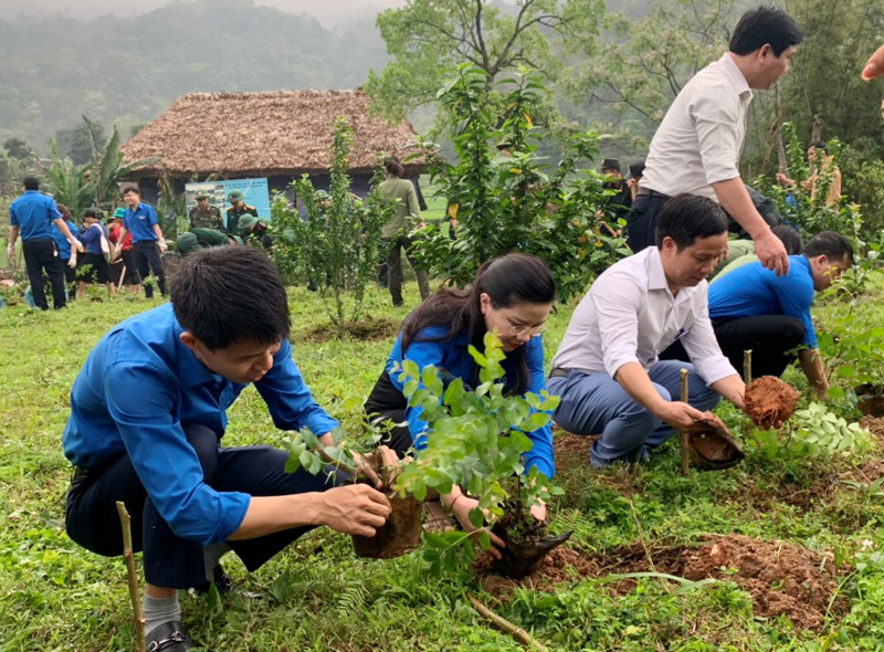 Các đại biểu cùng hơn 500 bạn ĐVTN các đơn vị Thành đoàn Hà Giang, Đoàn Thanh niên Công an tỉnh, Bộ Chỉ huy quân sự tỉnh, Bộ chỉ huy Biên phòng tỉnh, Đoàn khối Cơ quan - Doanh nghiệp tỉnh và xã Phương Độ tham gia trồng cây xanh