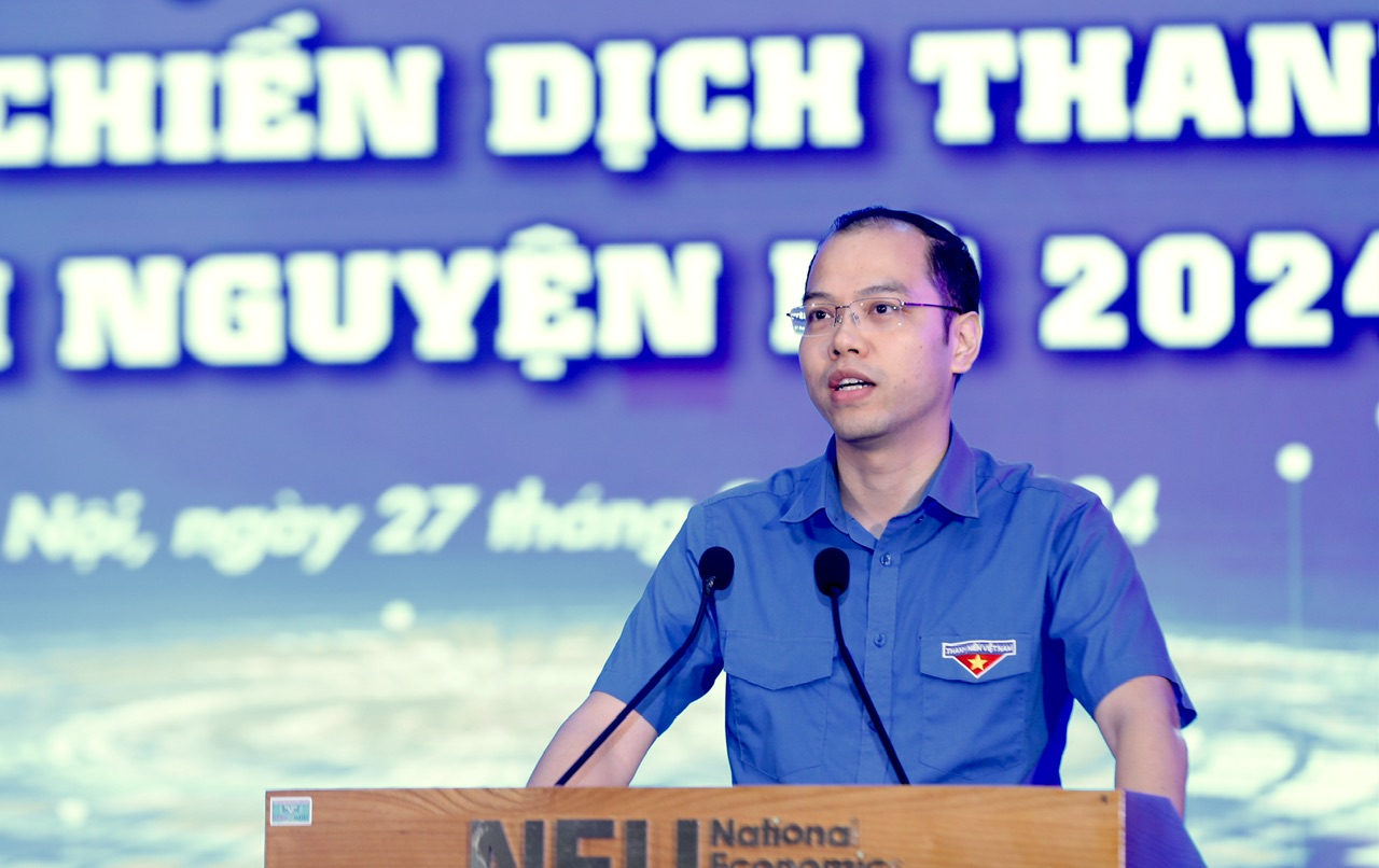 Phó Bí thư Thành đoàn Hà Nội, Chủ tịch Hội Sinh viên Việt Nam TP Hà Nội Nguyễn Tiến Hưng, Trưởng Ban chỉ đạo Chiến dịch thanh niên tình nguyện Hè phát biểu tại chương trình