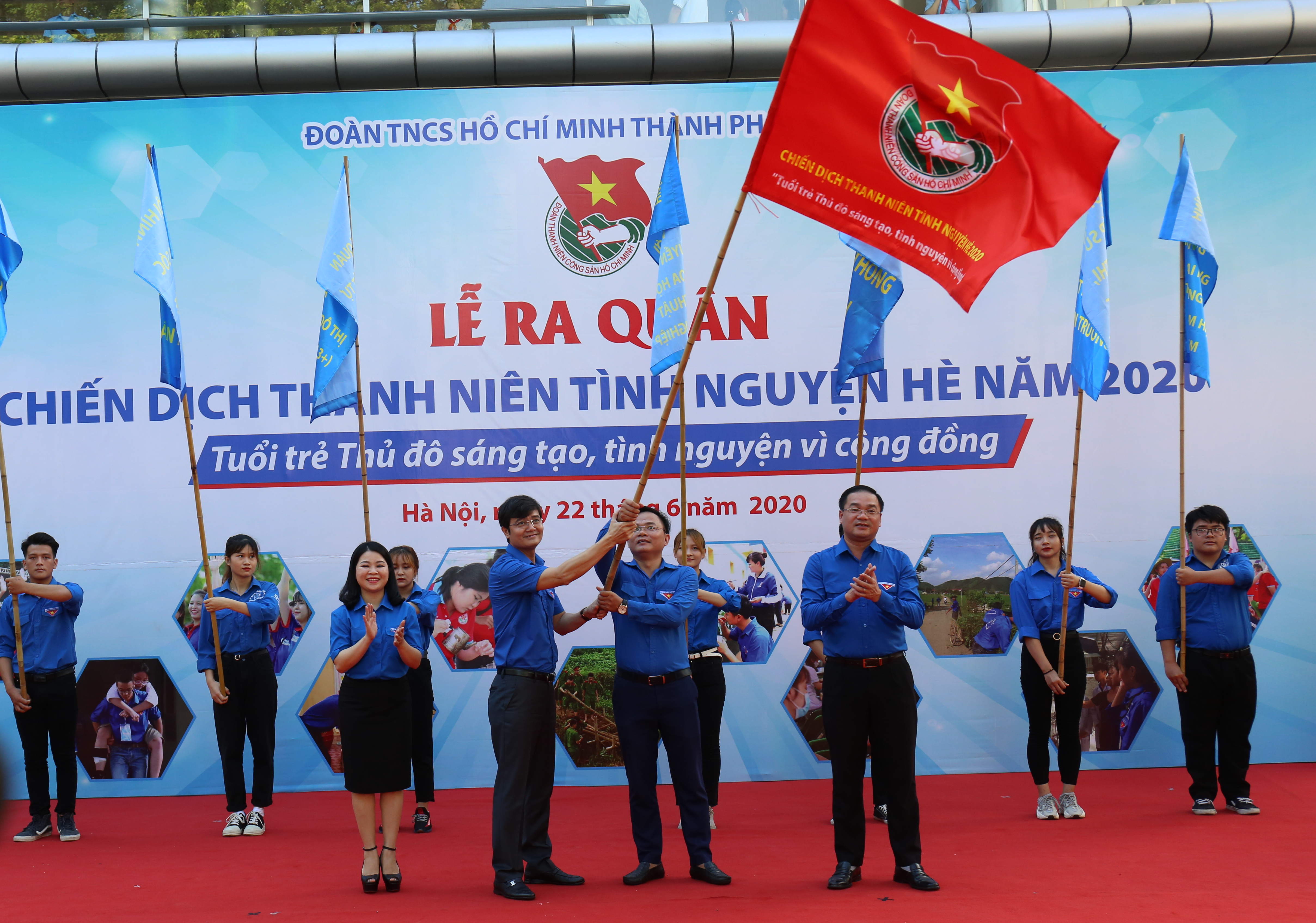 Đồng chí Nguyễn Ngọc Việt, Bí thư thành Đoàn Hà Nội và đồng chí Chu Hồng Minh, Phó Bí thư Thành Đoàn Hà Nội, Chủ tịch Hội Sinh viên thành phố Hà Nội trao cờ cho đội hình tình nguyện tại lễ ra quân