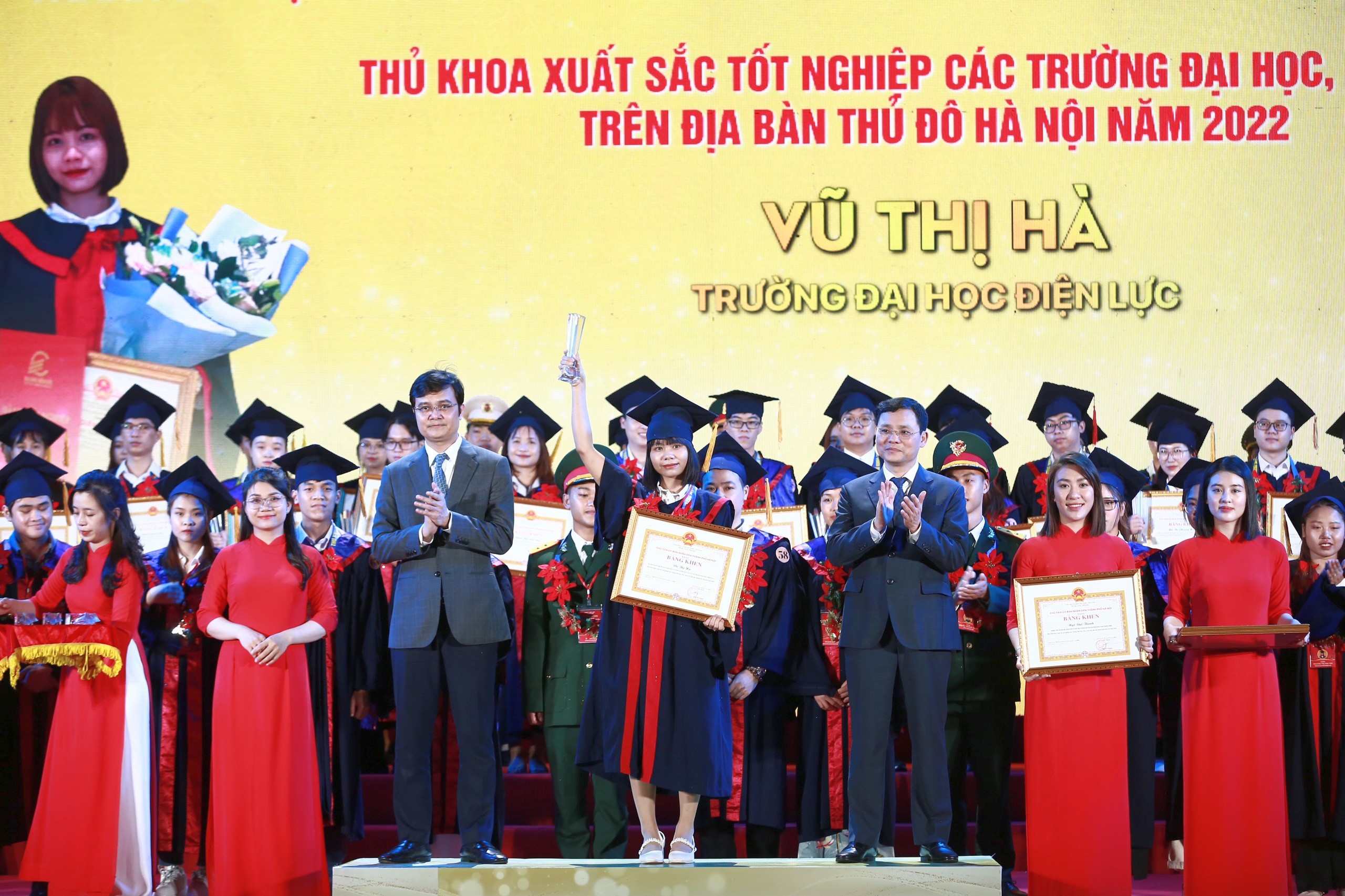 Bí thư thứ nhất Trung ương Đoàn Bùi Quang Huy và Phó Chủ tịch HĐND thành phố Hà Nội Phạm Quí Tiên trao Bằng khen cho các thủ khoa xuất sắc.