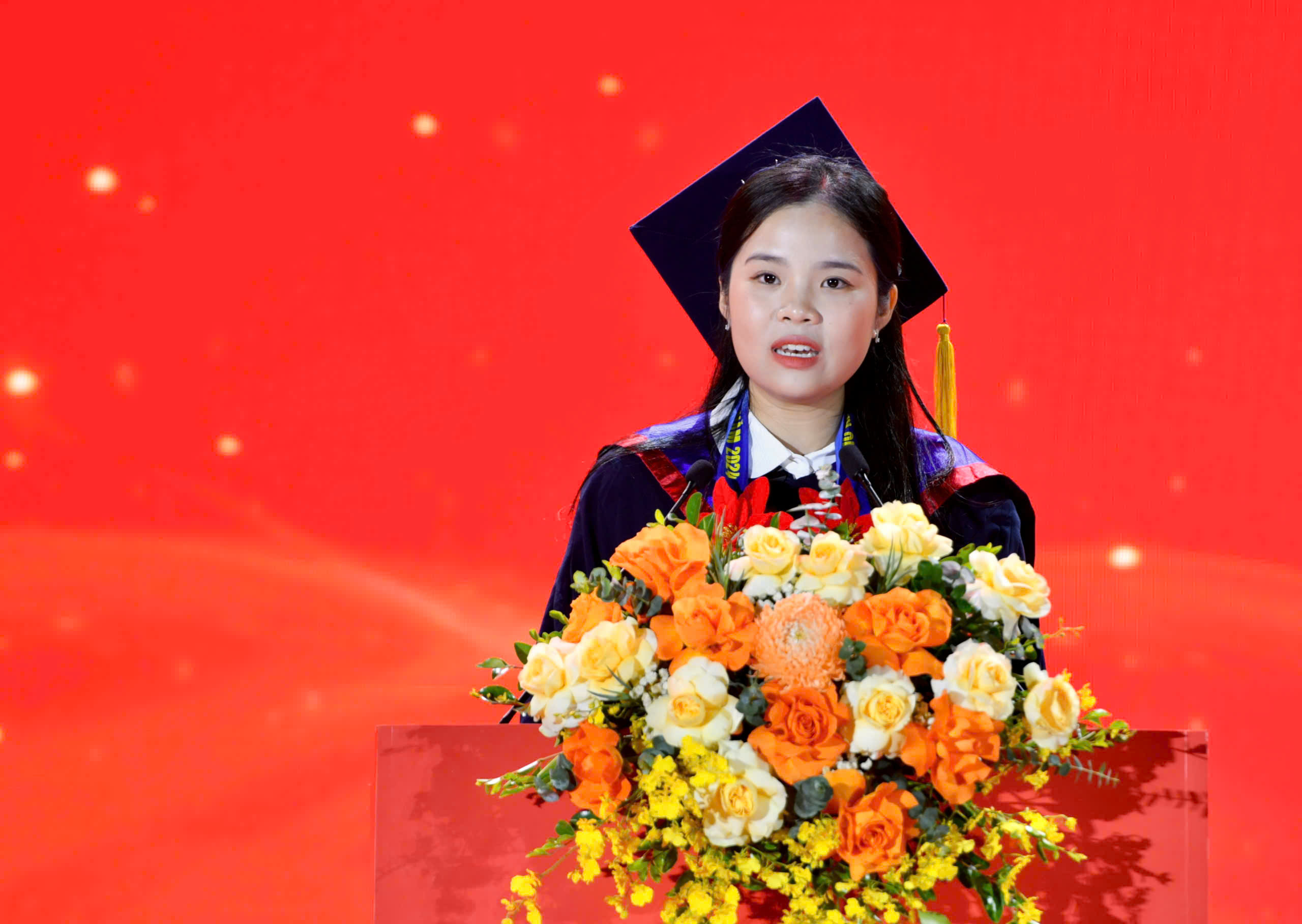 Em Vũ Thu Hằng, thủ khoa xuất sắc Trường Đại học Ngoại ngữ, Đại học Quốc gia Hà Nội thay mặt các thủ khoa phát biểu tại lễ tuyên dương