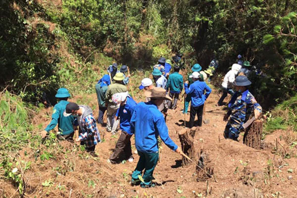 ĐVTN hỗ trợ làm đường băng, dọn cành cây, cỏ khô hạn chế lửa cháy lanh nhanh các khu vực khác.