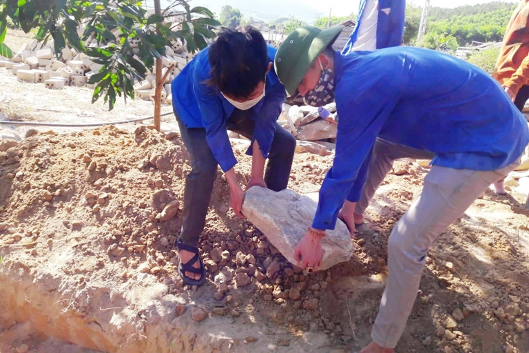 Sinh viên tình nguyện đồng hương Hà Tĩnh tại Học viện Nông nghiệp Việt Nam tham gia cùng tuổi trẻ và người dân thôn 1, xã Ân Phú, huyện Vũ Quang xây dựng nông thôn mới