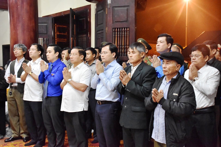 Đồng chí Nguyễn Anh Tuấn - Bí thư thường trực Trung ương Đoàn và đồng chí Lê Đình Sơn - UVBCH Trung ương Đảng, Bí thư Tỉnh ủy Hà Tĩnh cùng các đại biểu dâng hương tại nhà thờ anh hùng liệt sỹ Lý Tự Trọng