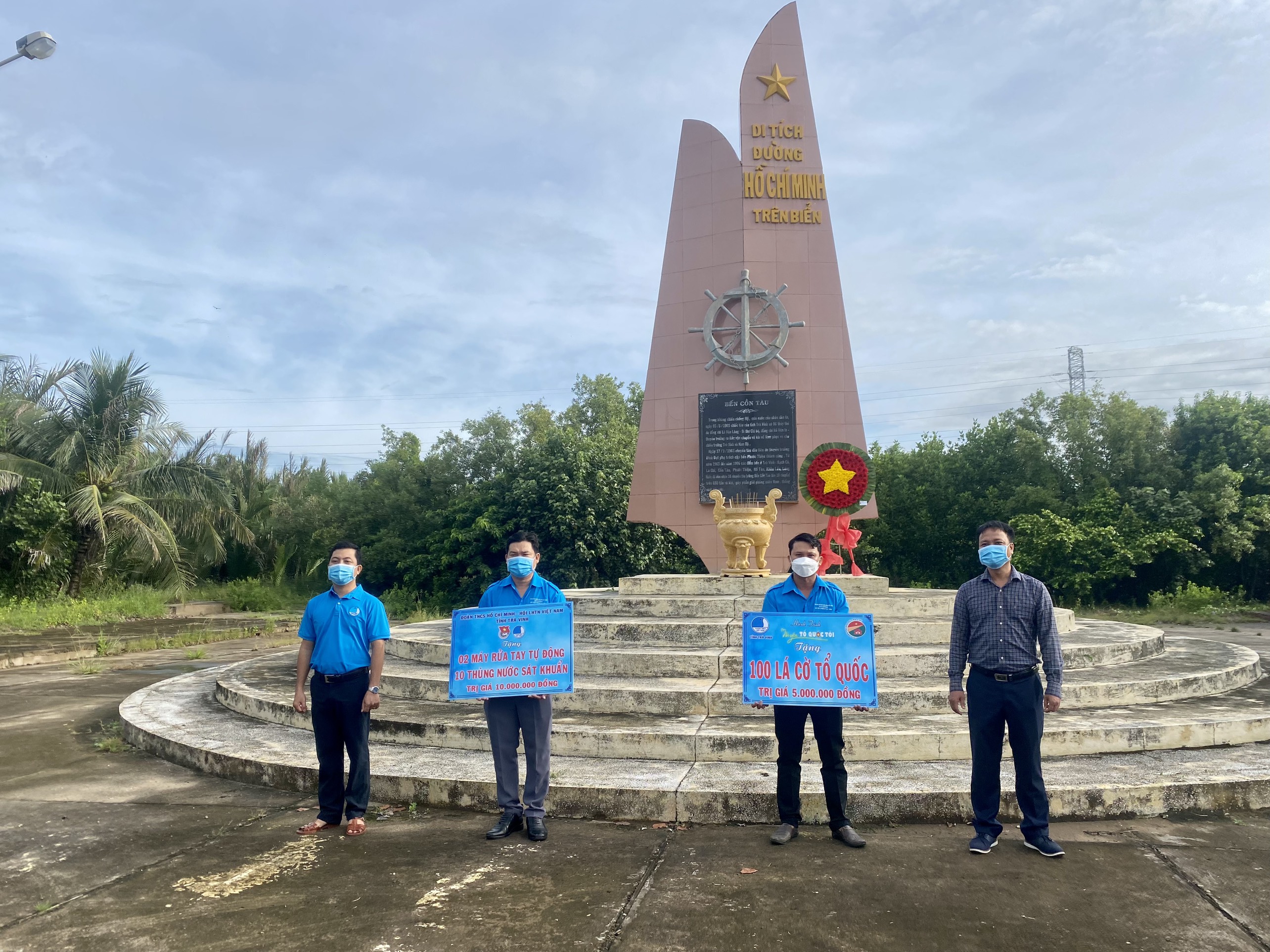 Đoàn đã đến dâng hoa, dâng hương bia tưởng niệm tại Khu di tích lịch sử cách mạng cấp quốc gia Bến tiếp nhận vũ khí Cồn Tàu thuộc ấp Cồn Tàu, xã Trường Long Hòa, thị xã Duyên Hải. Tại đây, đoàn đã nghe thuyết minh về quá trình hình thành của Bến tiếp nhận vũ khí cũng như quá trình hoạt động của Bến. Được biết, đây là một trong những mắc xích quan trọng của Đường mòn Hồ Chí Minh trên biển,  trong suốt 15 năm hoạt động đây là nơi tiếp nhận 20 chuyến hàng tiếp nhận vũ khí, trang thiết bị chiến tranh do miền Bắc chi viện. Đoàn đã tiến hành trao tặng 02 máy rửa tay tự động, 10 thùng nước rửa tay sát khuẩn; 100 “Túi thuốc an sinh” (do MTQ ở Tp Hồ Chí Minh hỗ trợ) và một số phần quà khác. Tổng giá trị các phần quà gần 20 triệu đồng.