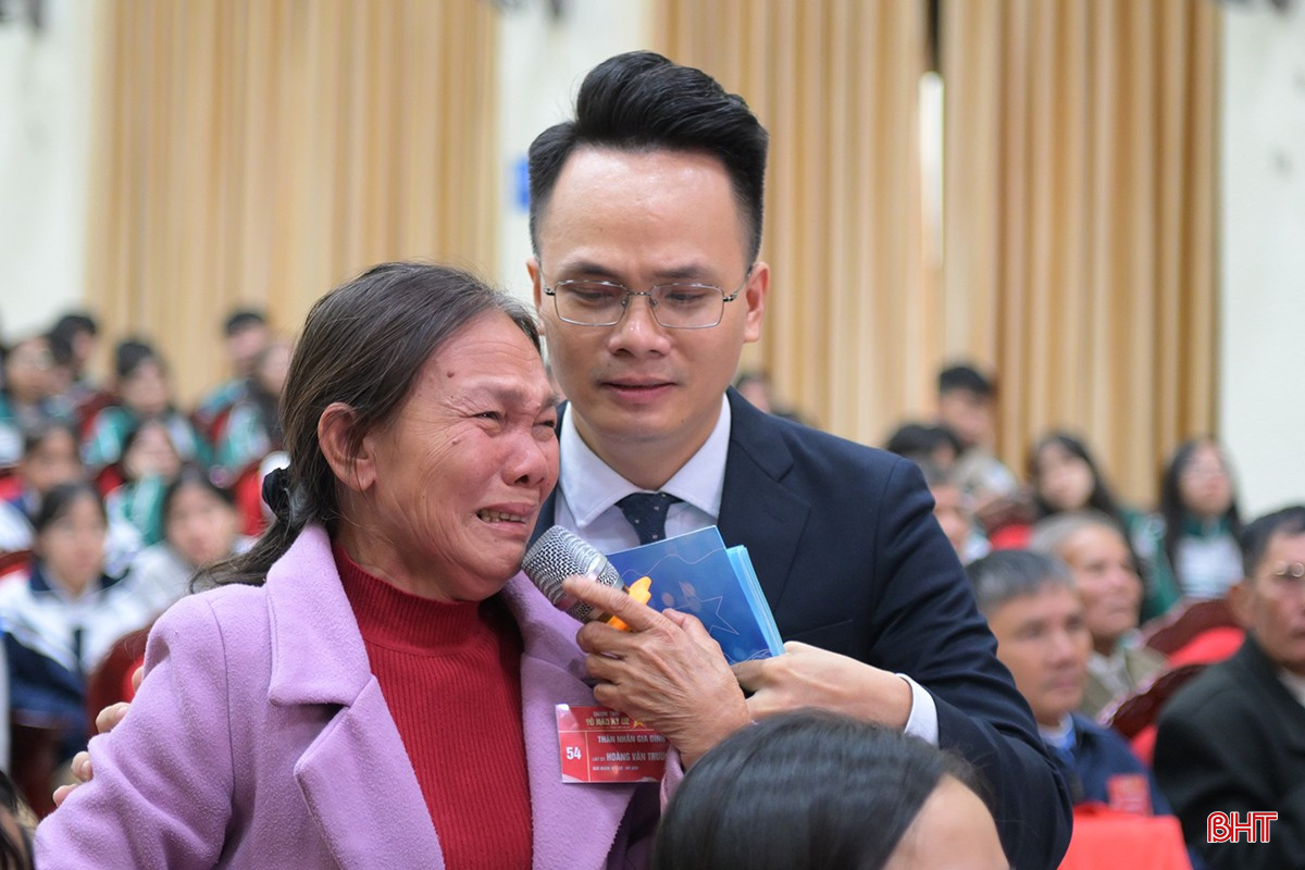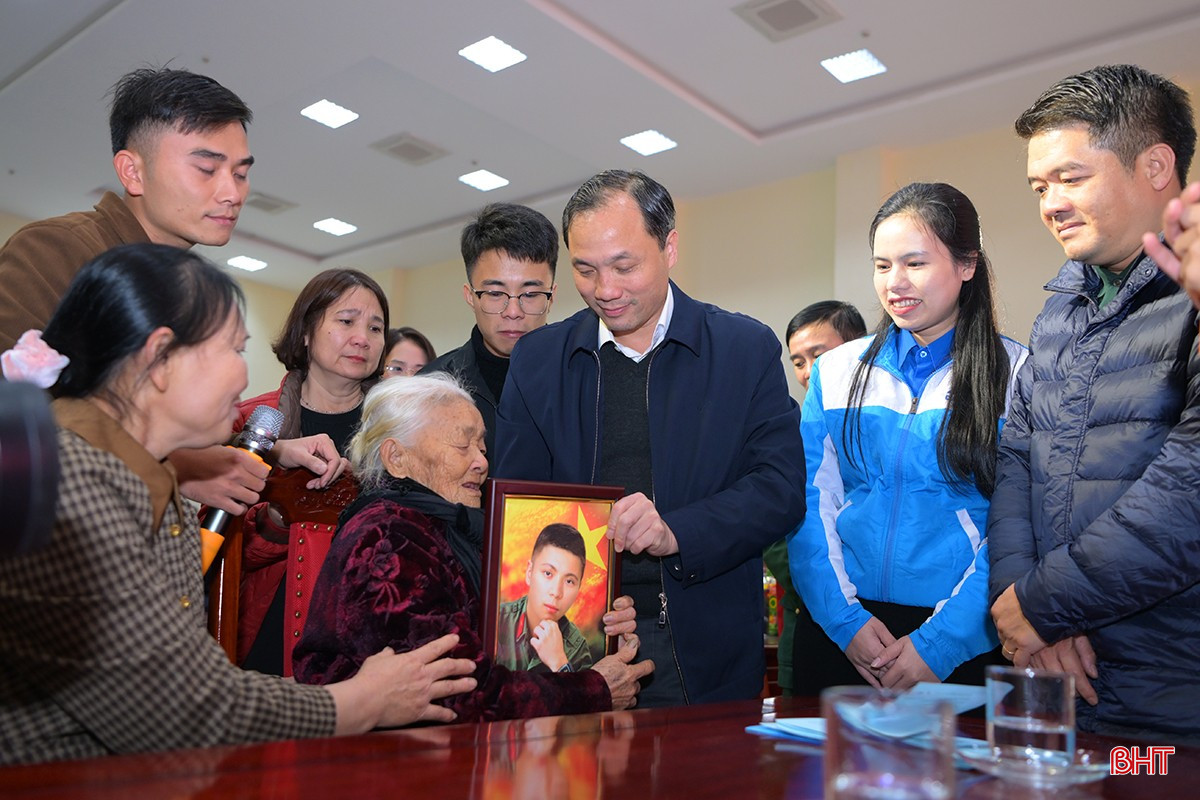Bí thư Tỉnh ủy Hoàng Trung Dũng trao tặng di ảnh liệt sĩ cho mẹ Nguyễn Thị Như (Mẹ liệt sĩ Nguyễn Xuân Thịnh, quê xã Thạch Trị, huyện Thạch Hà).