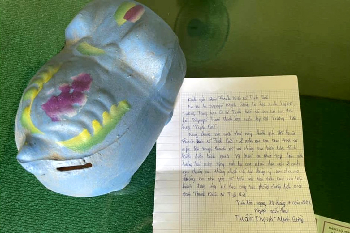 Chị Nguyễn Thị Lam, Phó Bí thư Đoàn xã Tịnh Bắc cho biết, được sự đồng ý của ba mẹ, hai em Nguyễn Mạnh Cường học sinh lớp 8D, trường THCS Tịnh Bắc và Nguyễn Tuấn Thịnh học sinh lớp 4B, trường TH Tịnh Bắc (huyện Sơn Tịnh) là anh em ruột, cùng mang lá thư và heo đất tiết kiệm đựng số tiền trên đến Đoàn xã Tịnh Bắc để ủng hộ công tác phòng chống dịch COVID-19. Toàn bộ số tiền được hai anh em tiết kiệm từ tiền thưởng học sinh giỏi và tiền ăn sáng.