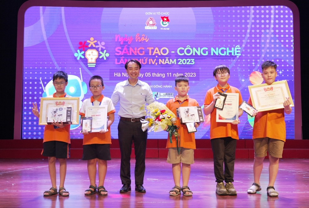 Đồng chí Nguyễn Thiên Tú - Giám đốc Trung tâm phát triển KHCN và Tài năng trẻ T.Ư Đoàn trao giải Nhất cho các đội thi
