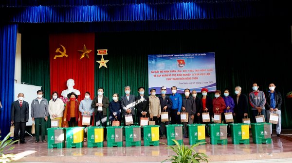 Đồng chí Nguyễn Hồng Sáng đại diện BTC trao tặng các chế phẩm, thùng xử lý rác thải hữu cơ, thùng rác phân loại cho các hộ dân trên địa bàn xã Cộng Hòa, Nam Sách.