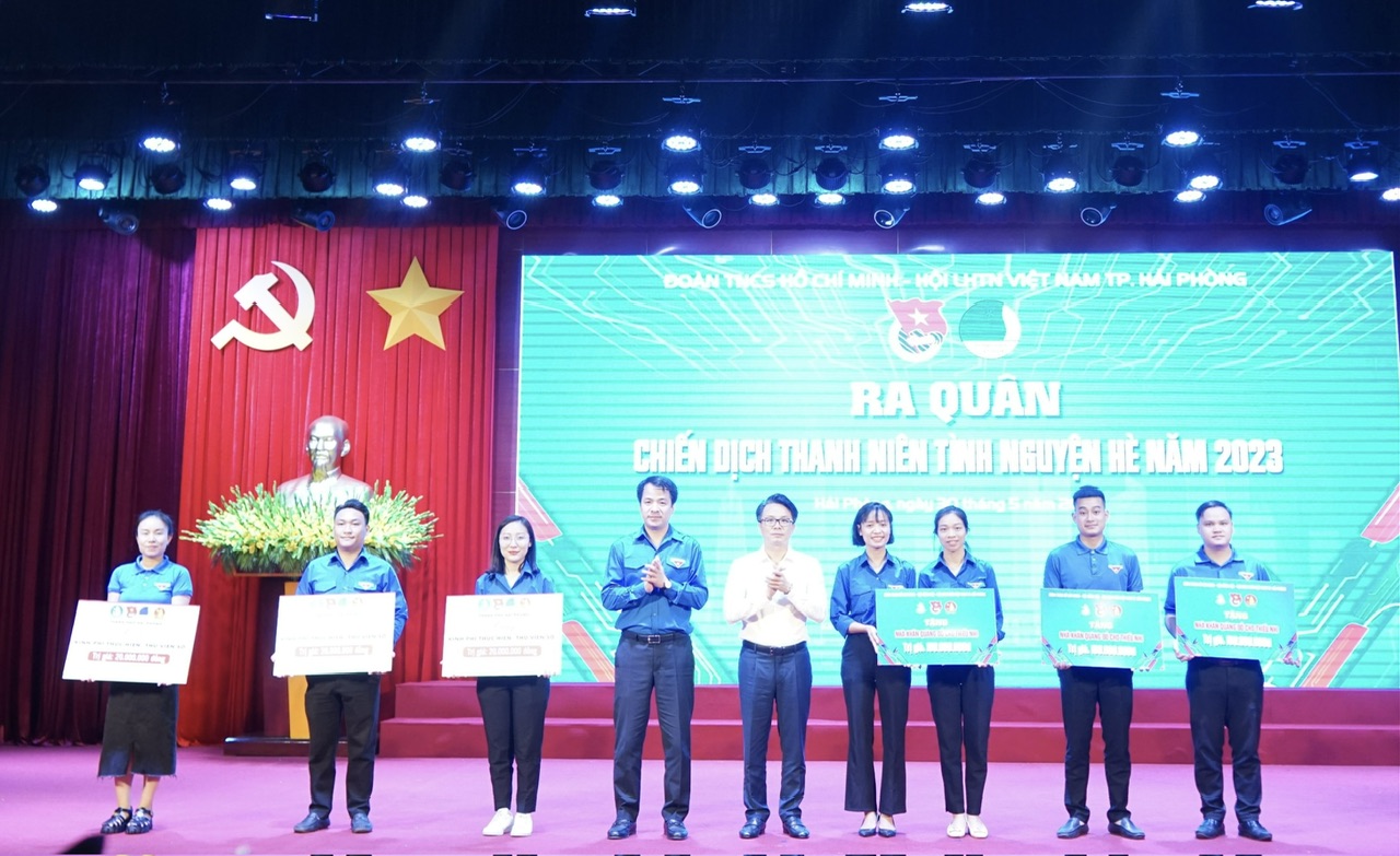 Đồng chí Ngô Văn Cương - Bí thư Trung ương Đoàn; đồng chí Lê Trí Vũ - Uỷ viên Ban Thường vụ Thành uỷ, Trưởng Ban Dân vận Thành uỷ trao tặng kinh phí cho quận đoàn Ngô Quyền, Quận đoàn Kiến An và huyện đoàn Tiên Lãng