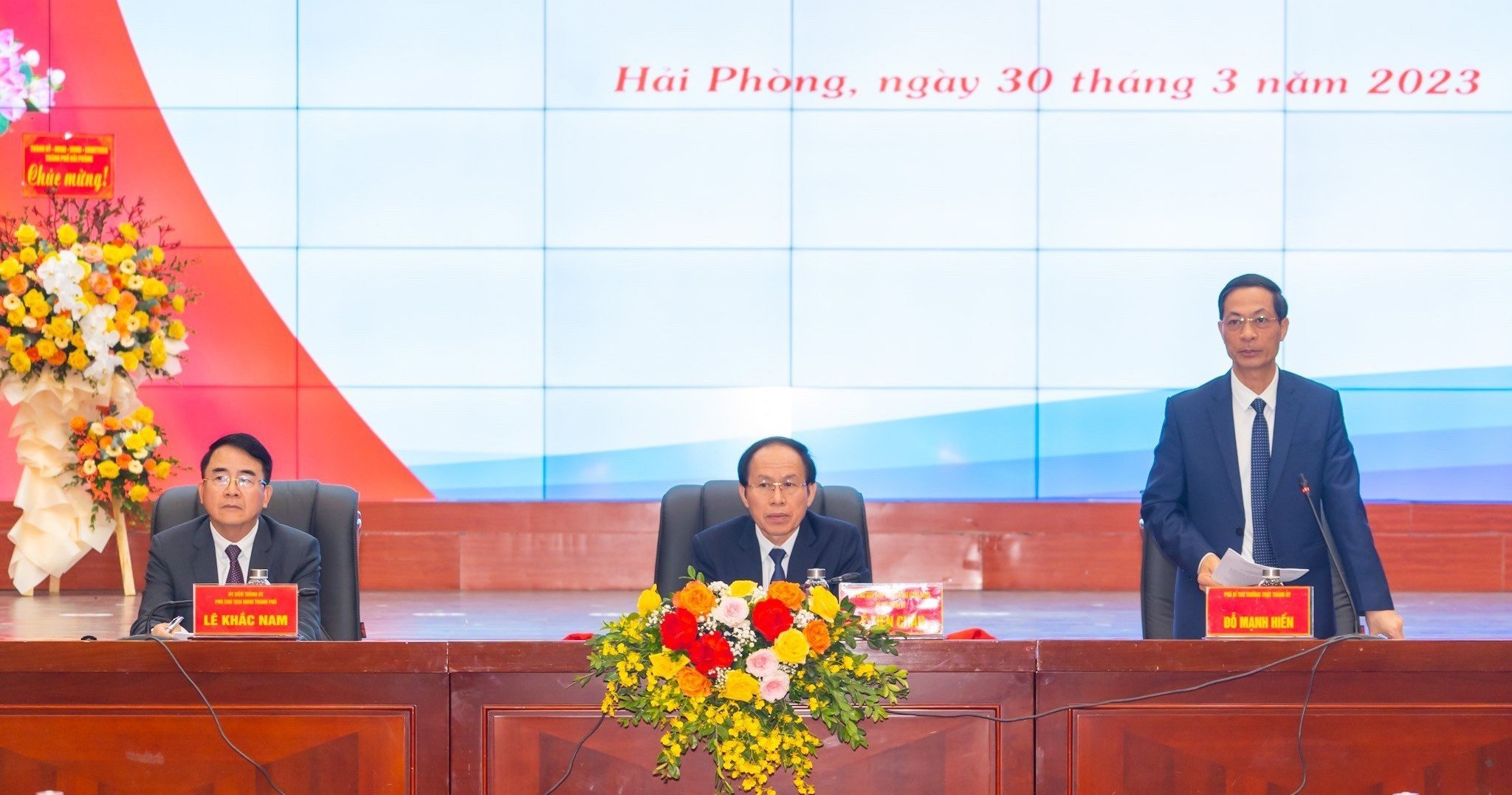 Chủ trì Hội nghị có các đồng chí: Lê Tiến Châu - Ủy viên Ban Chấp hành Trung ương Đảng, Bí thư Thành ủy Hải Phòng; Đồng chí Đỗ Mạnh Hiến - Phó Bí thư Thường trực Thành uỷ; đồng chí Lê Khắc Nam - Uỷ viên Thành uỷ, Phó Chủ tịch Uỷ ban nhân dân thành phố.