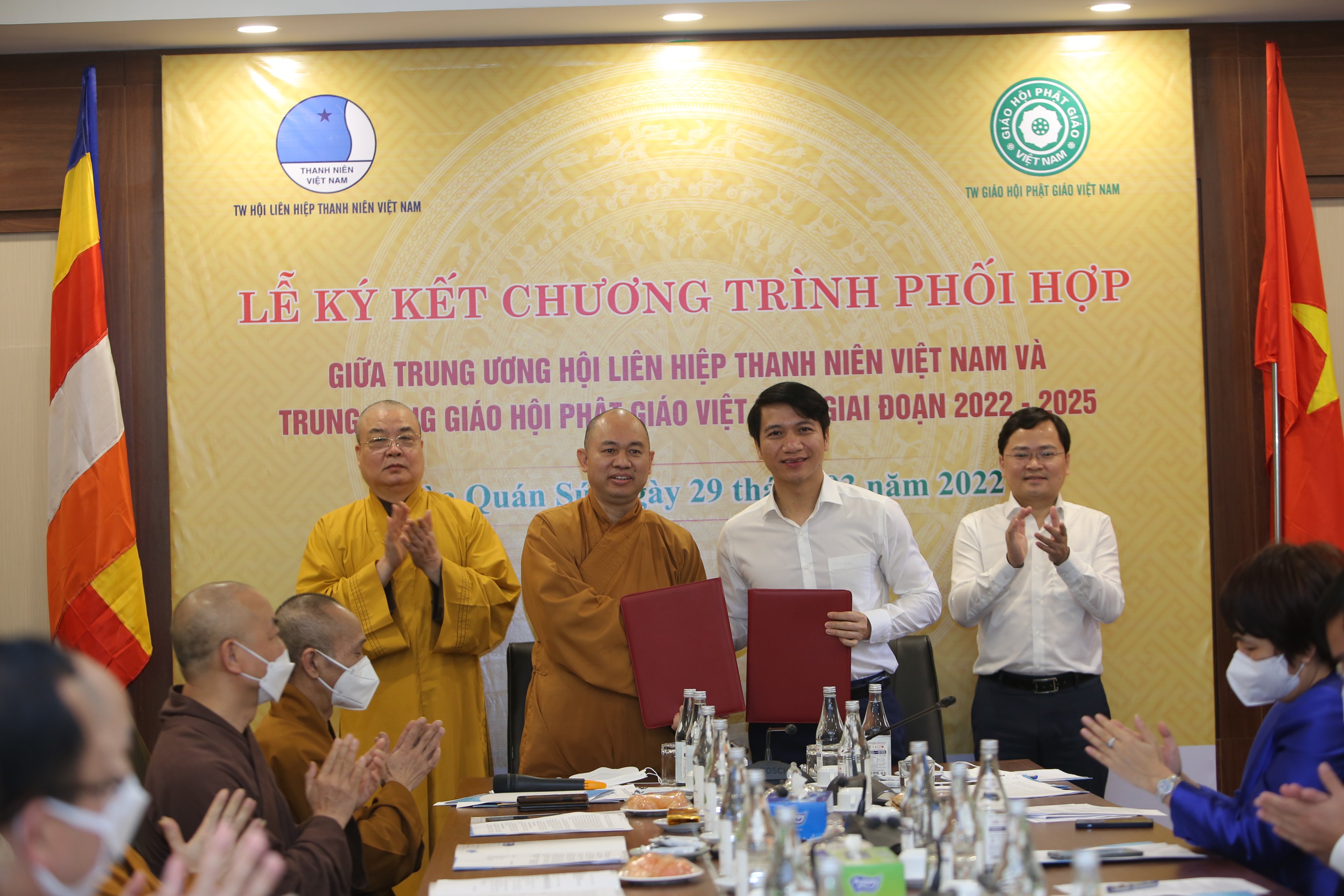 Đồng chí Nguyễn Ngọc Lương - Bí thư Trung ương Đoàn, Chủ tịch Hội LHTN Việt Nam và Thượng tọa Thích Đức Thiện - Phó Chủ tịch, Tổng Thư ký Hội đồng trị sự Giáo hội Phật giáo Việt Nam cùng đại diện lãnh đạo hai bên tham gia ký kết chương trình