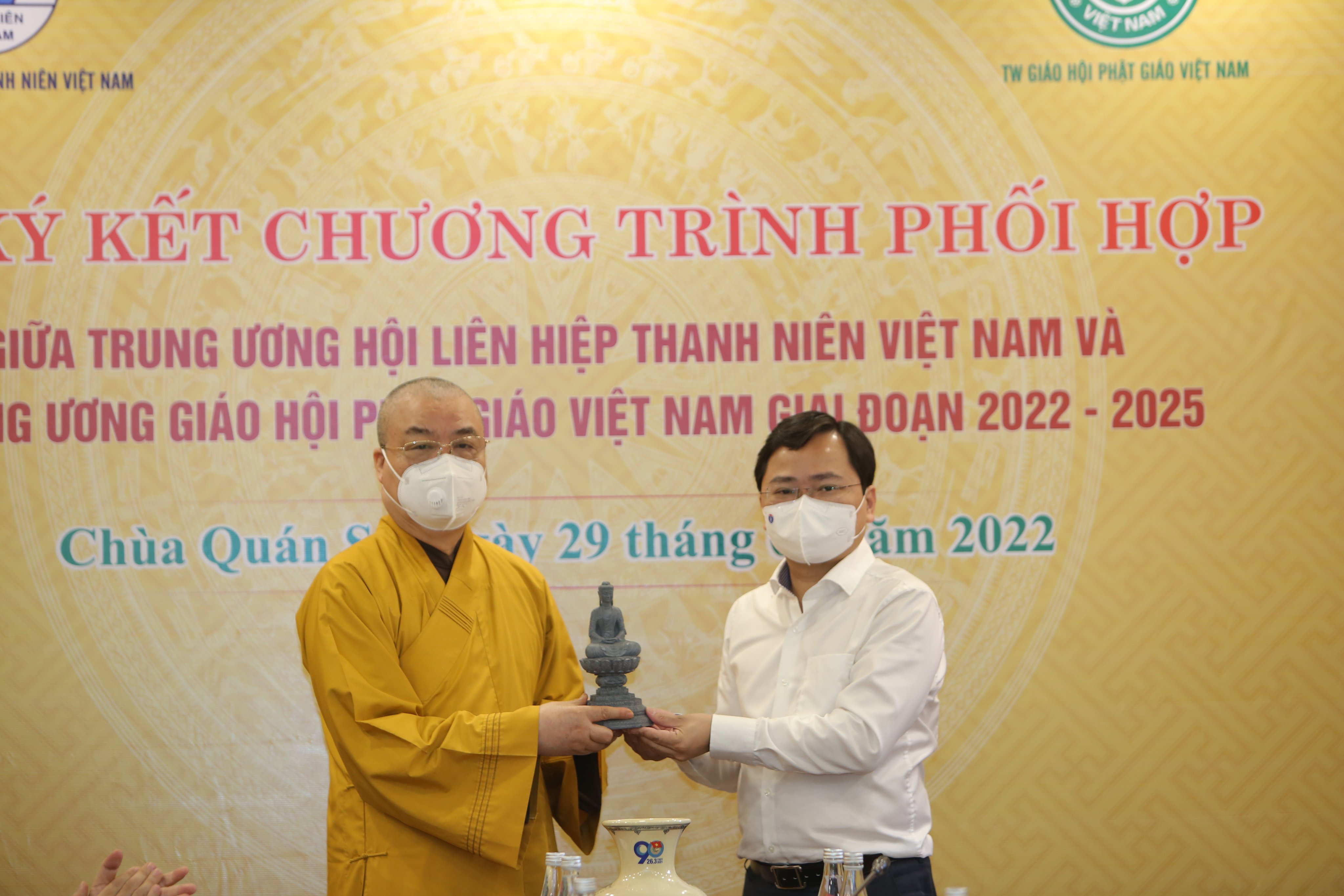Thượng tọa Thích Thanh Nhiễu- Phó Chủ tịch thường trực Hội đồng trị sự Giáo hội Phật giáo Việt Nam tặng quà cho đồng chí Nguyễn Anh Tuấn - Ủy viên T.Ư Đảng, Bí thư thứ nhất Trung ương Đoàn