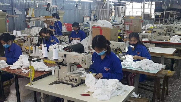 Đoàn viên thanh niên mượn máy tại xưởng may để may khẩu trang miễn phí cho bà con tại Bảo Thành