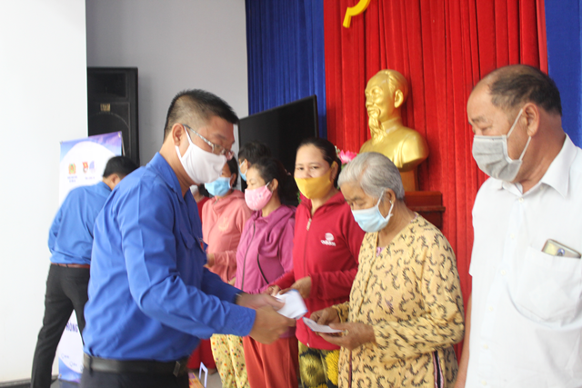 Đồng chí Võ Trần Tuấn Thanh – Tỉnh ủy viên, Bí thưTỉnh đoàn trao quà cho thanh niên công nhân có hoàn cảnh khó khăn