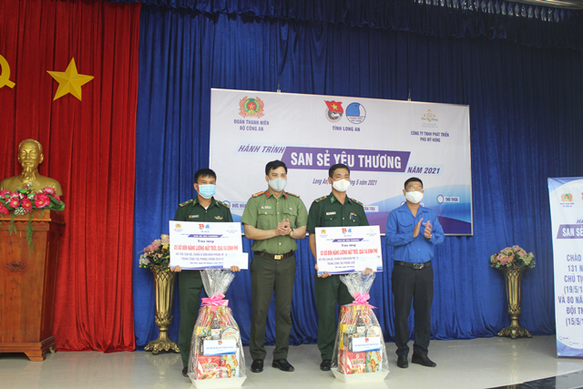 Hành trình “San sẻ yêu thương” nhằm chăm lo các gia đình chính sách, thanh niên công nhân, cán bộ, chiến sĩ bộ đội biên phòng đang làm nhiệm vụ phòng chống dịch Covid-19 và tặng học bổng cho học sinh vượt khó, học giỏi tại 06 đơn vị: huyện Đức Hòa, Đức Huệ, Cần Giuộc, Bến Lức, Thủ Thừa, Tân Trụ.