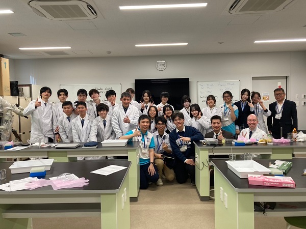Các bạn đại biểu và học sinh trường Trung học Phổ thông Shiba Kokusai Highschool chụp ảnh kỉ niệm sau buổi thực hành điện di DNA và thí nghiệm tách chiết DNA của chuối.