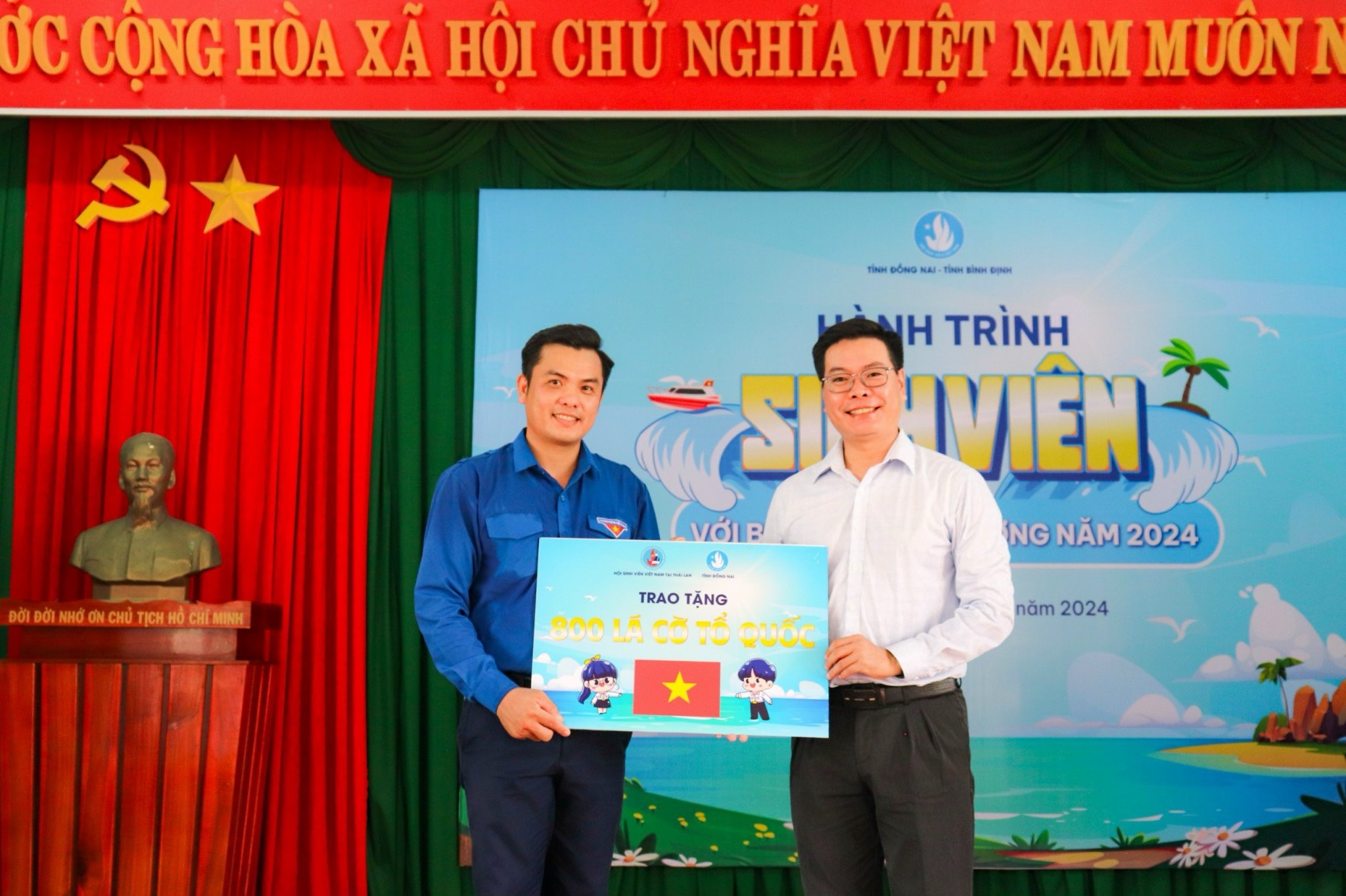 Đồng chí Võ Văn Trung - Chủ tịch Hội Sinh viên tỉnh trao tặng bảng tượng trưng 800 cờ Tổ quốc cho Hội Sinh viên tỉnh Bình Định