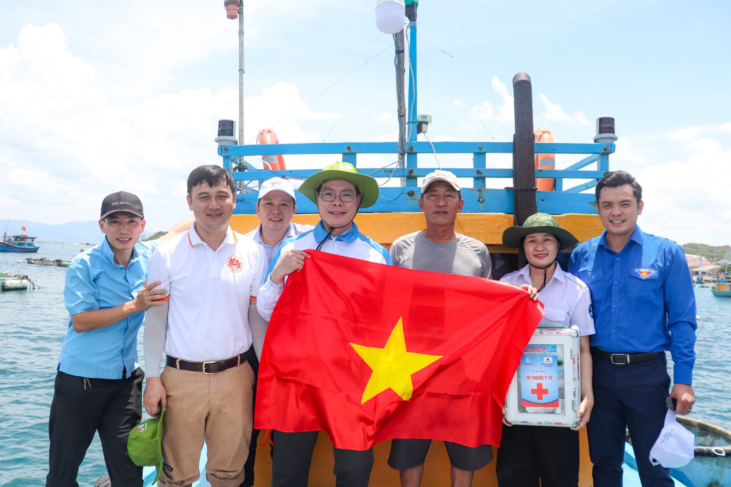 Đồng chí Huỳnh Minh Đức - Phó Trưởng phòng đoàn thể và các hội, Ban Dân vận Tỉnh uỷ và đồng chí Võ Văn Trung - Chủ tịch Hội Sinh viên tỉnh trao tặng cờ Tổ quốc, tủ thuốc y tế cho người dân