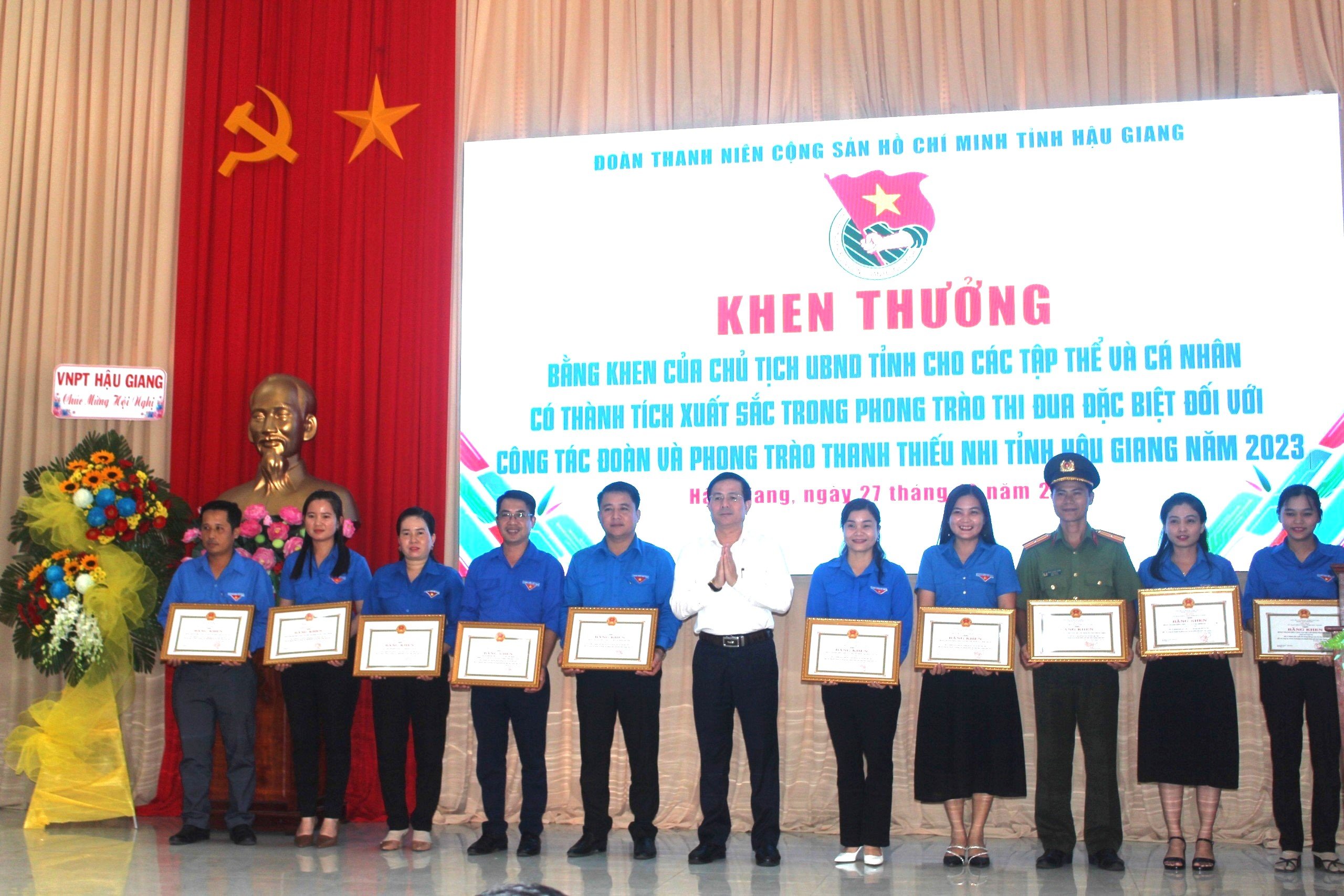 Nhân dịp này, Ban Tổ chức Hội nghị đã trao tặng Bằng khen của Chủ tịch UBND tỉnh cho 10 tập thể và 15 cá nhân đã có thành tích xuất sắc trong phong trào thi đua đặc biệt đối với công tác Đoàn và phong trào thanh thiếu nhi tỉnh Hậu Giang năm 2023; Bằng khen của Ủy ban Trung ương Hội LHTN Việt Nam cho 02 tập thể, 10 cá nhân có thành tích xuất sắc trong công tác Hội và phong trào thanh niên năm 2023; Cờ thi đua xuất sắc và Bằng khen của Ban Chấp hành Tỉnh đoàn cho 05 đơn vị (xếp hạng Nhất, Nhì, Ba của khối huyện, thị, thành đoàn và Nhất, Nhì khối Đoàn trực thuộc);
