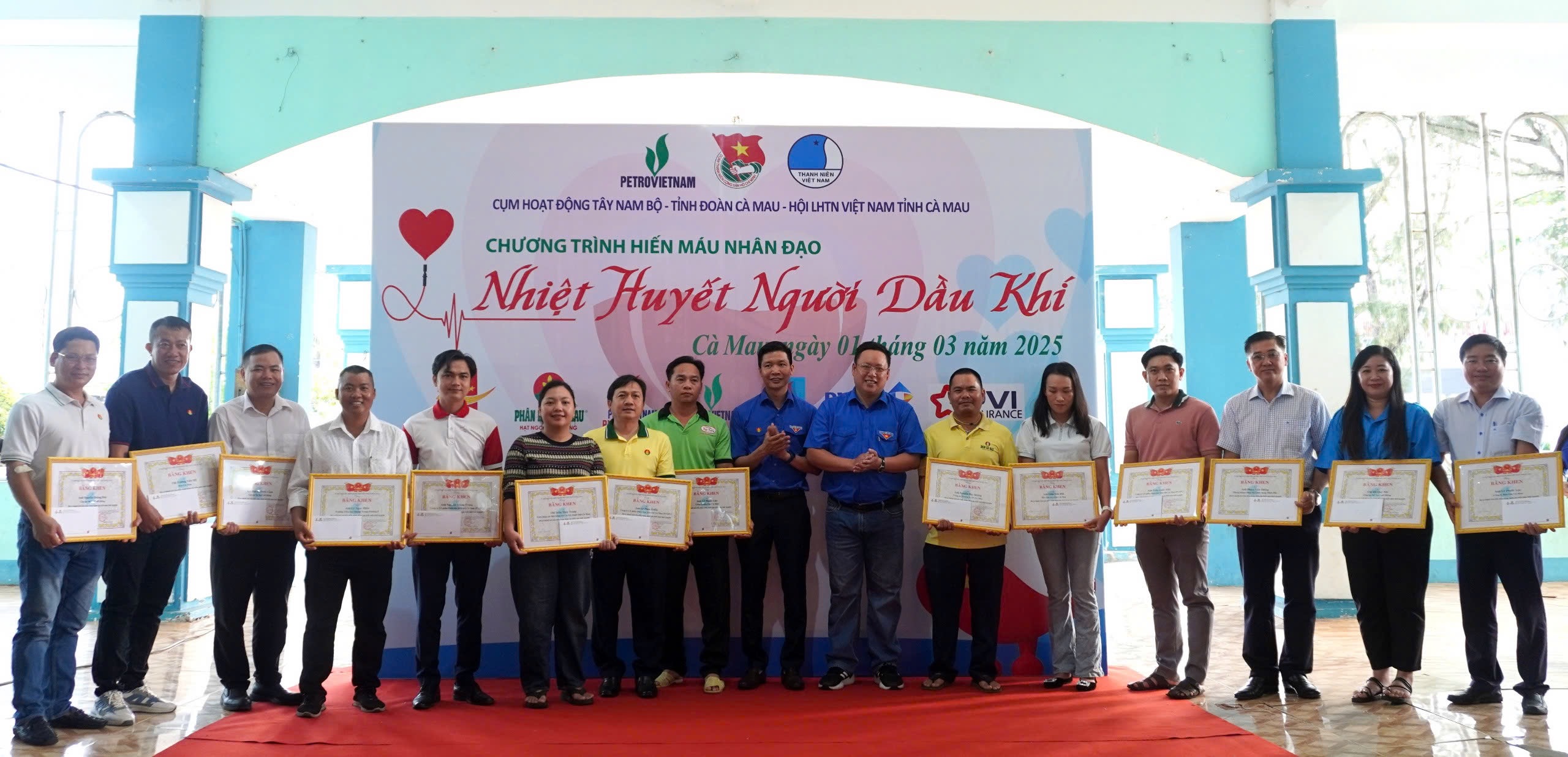 Đồng chí Nguyễn Ngọc Thuận, Phó Bí thư thường trực Tỉnh đoàn, Chủ tịch Hội LHTN Việt Nam tỉnh và đồng chí Nguyễn Văn Tú Bí thư Đoàn Thanh niên Công ty Cổ phần Phân bón Dầu khí Cà Mau tặng bằng khen cho 15 cá nhân đã hiến màu tình nguyện trên 15 lần