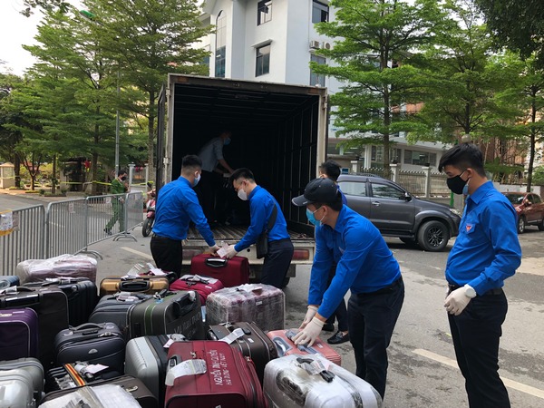 Đội hình thanh niên tình nguyện phòng, chống Covid-19 cấp Thành phố hỗ trợ chuyển đồ tại các khu cách ly