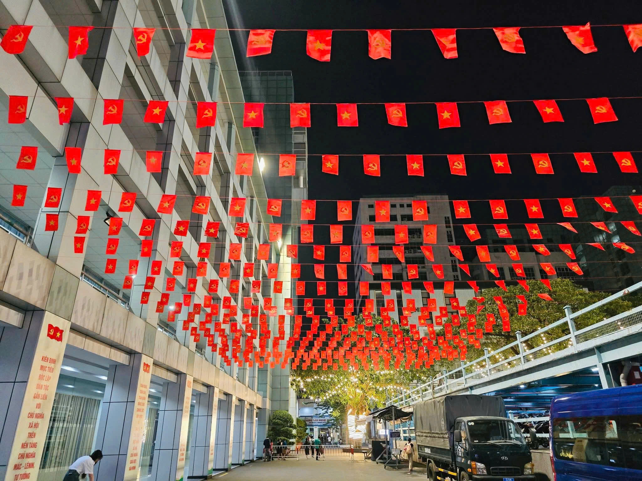 Tại Trường ĐH Công nghiệp TP.HCM, những dải cờ Tổ quốc và cờ Đảng được treo dọc theo các lối đi của khu vực sân trường, tạo nên một không gian rực rỡ và trang trọng. Hoạt động này đã thu hút sự quan tâm của đông đảo sinh viên, nhiều bạn đã tranh thủ chụp ảnh, check-in, lưu lại những khoảnh khắc tự hào tại các khu vực được trang trí nhằm lưu giữ kỷ niệm và truyền thông lên các trang mạng xã hội.