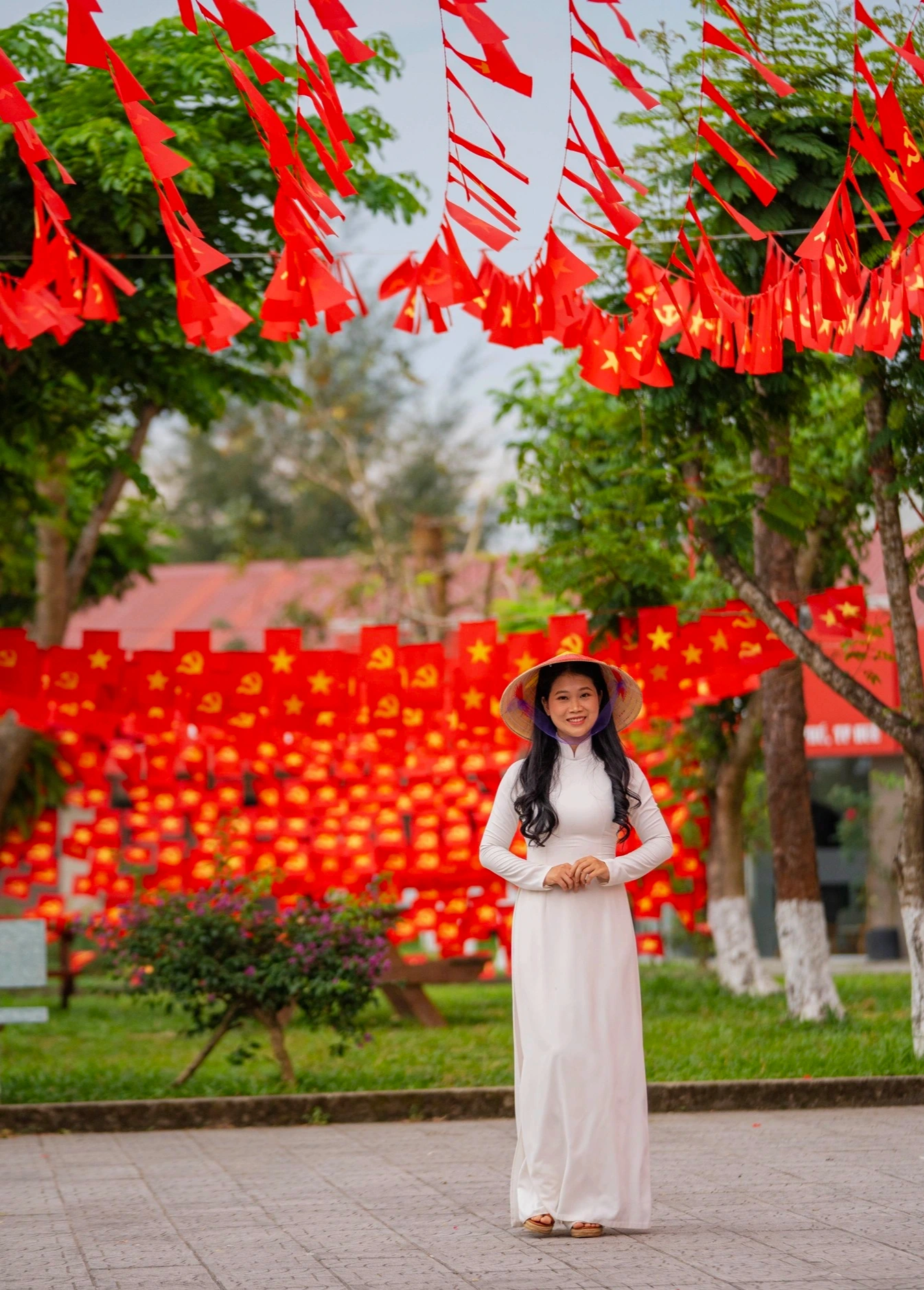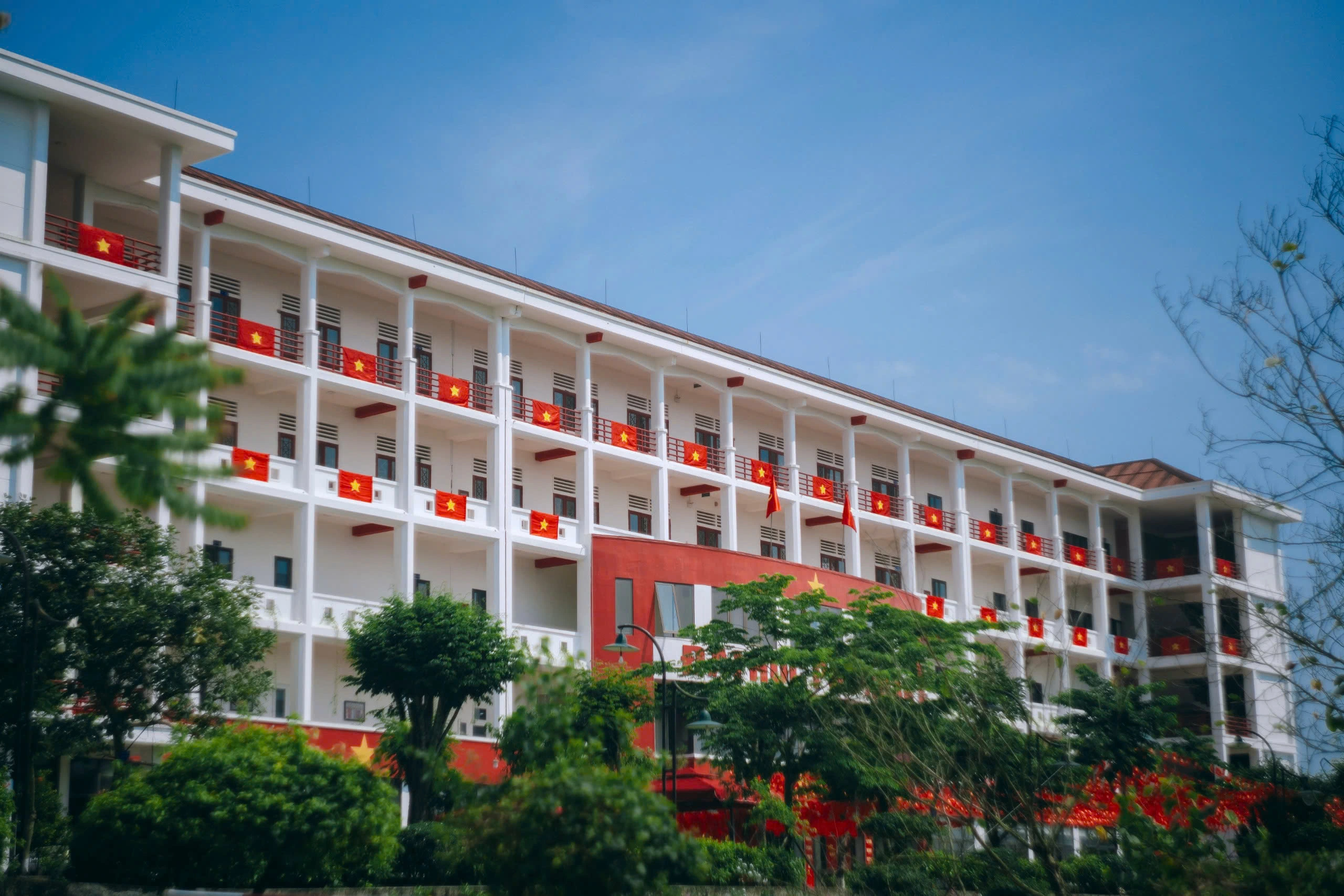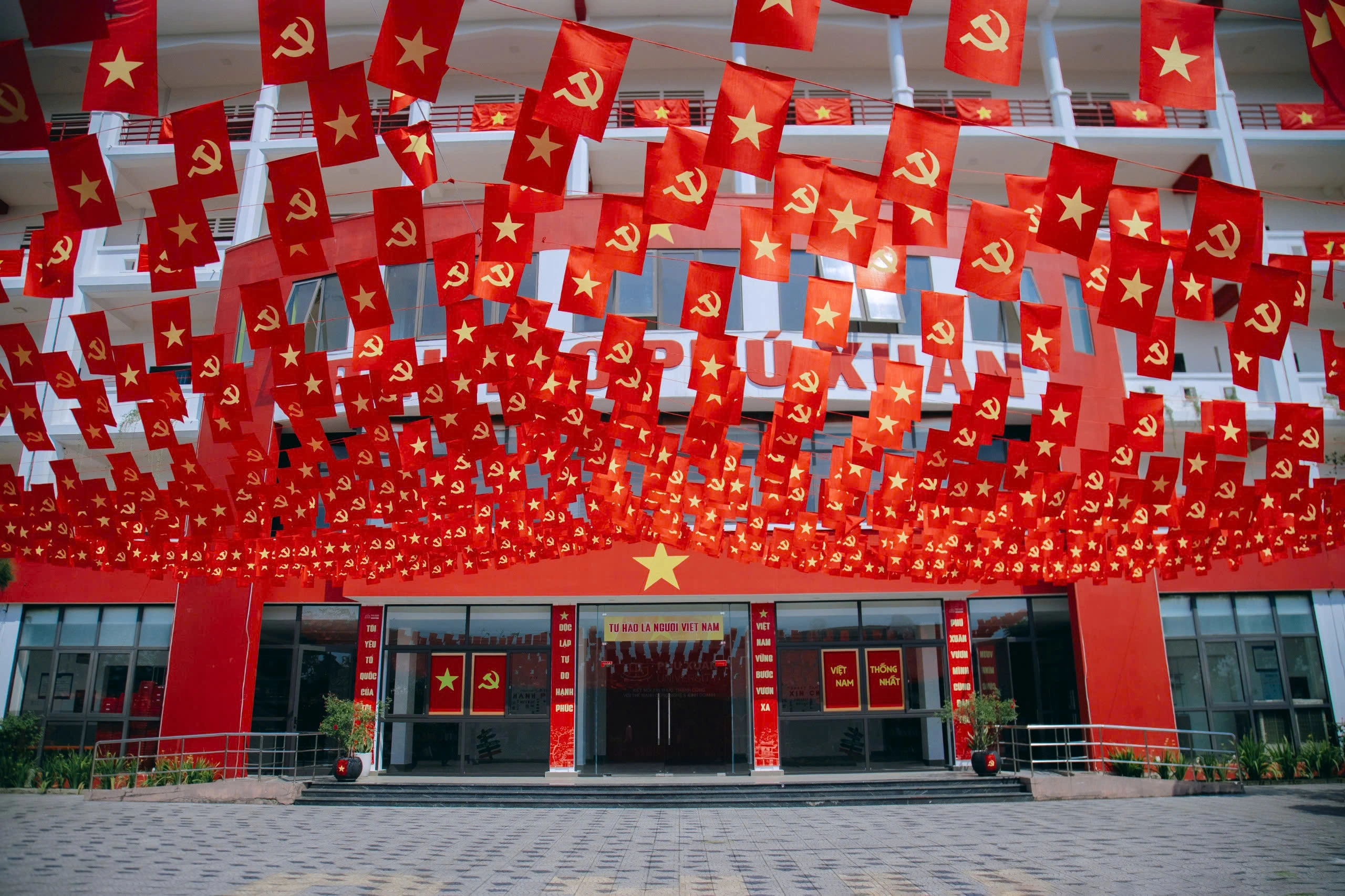 Từ cổng trường đến các dãy giảng đường, đâu đâu cũng tràn ngập sắc đỏ của cờ Tổ quốc và cờ Đảng. Hàng ngàn lá cờ tung bay trong gió, tạo nên một khung cảnh vừa trang trọng, vừa trẻ trung và đầy khí thế.