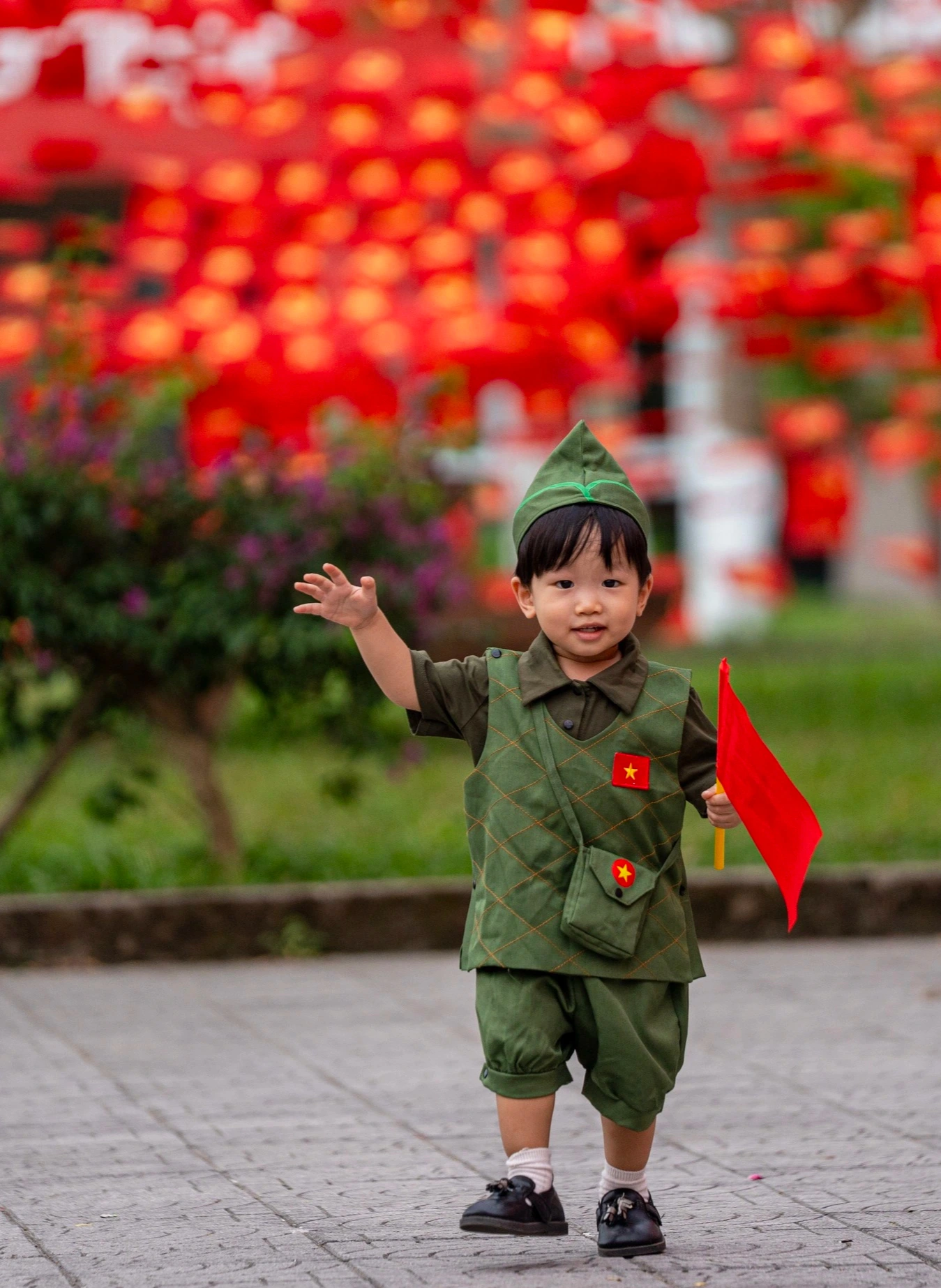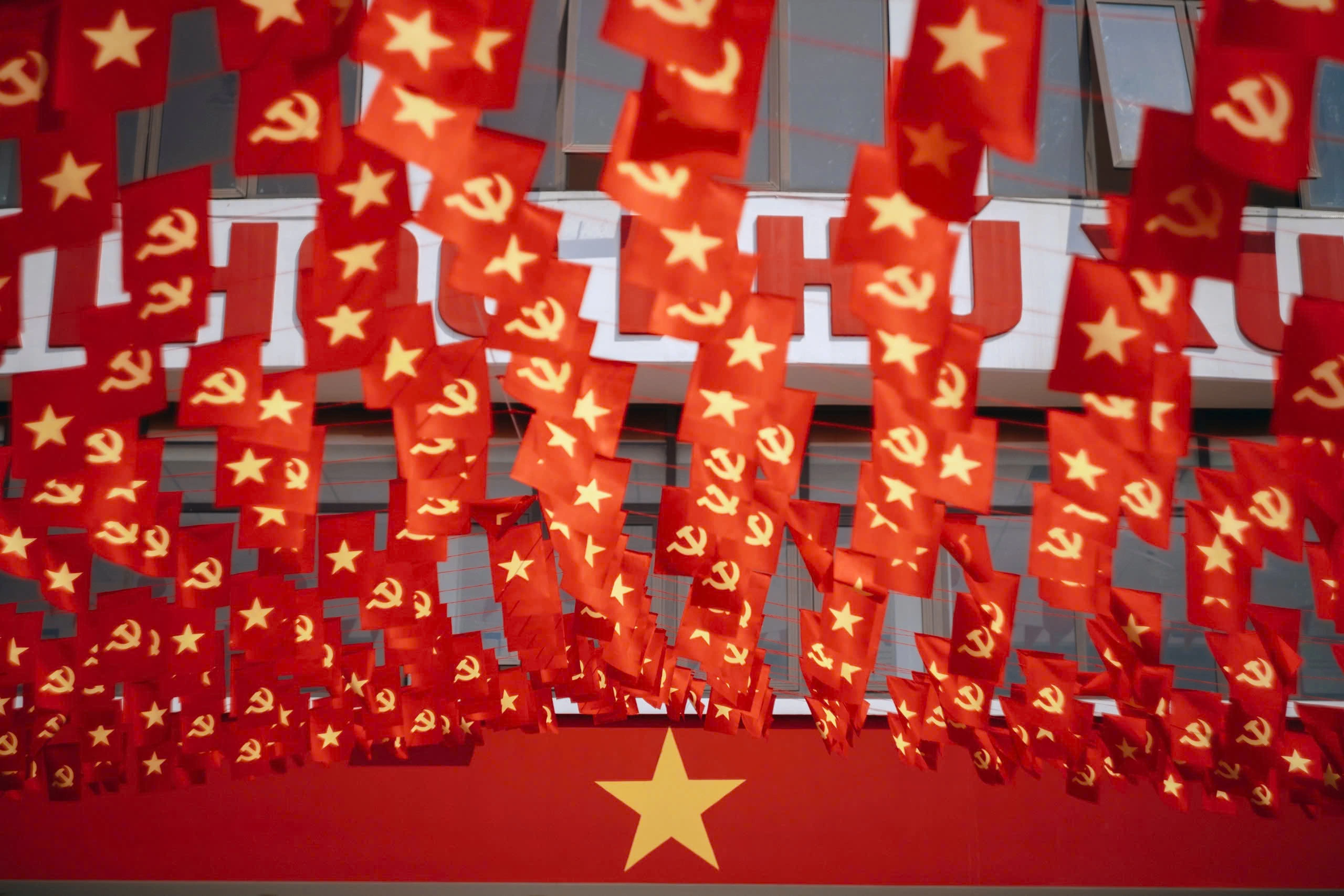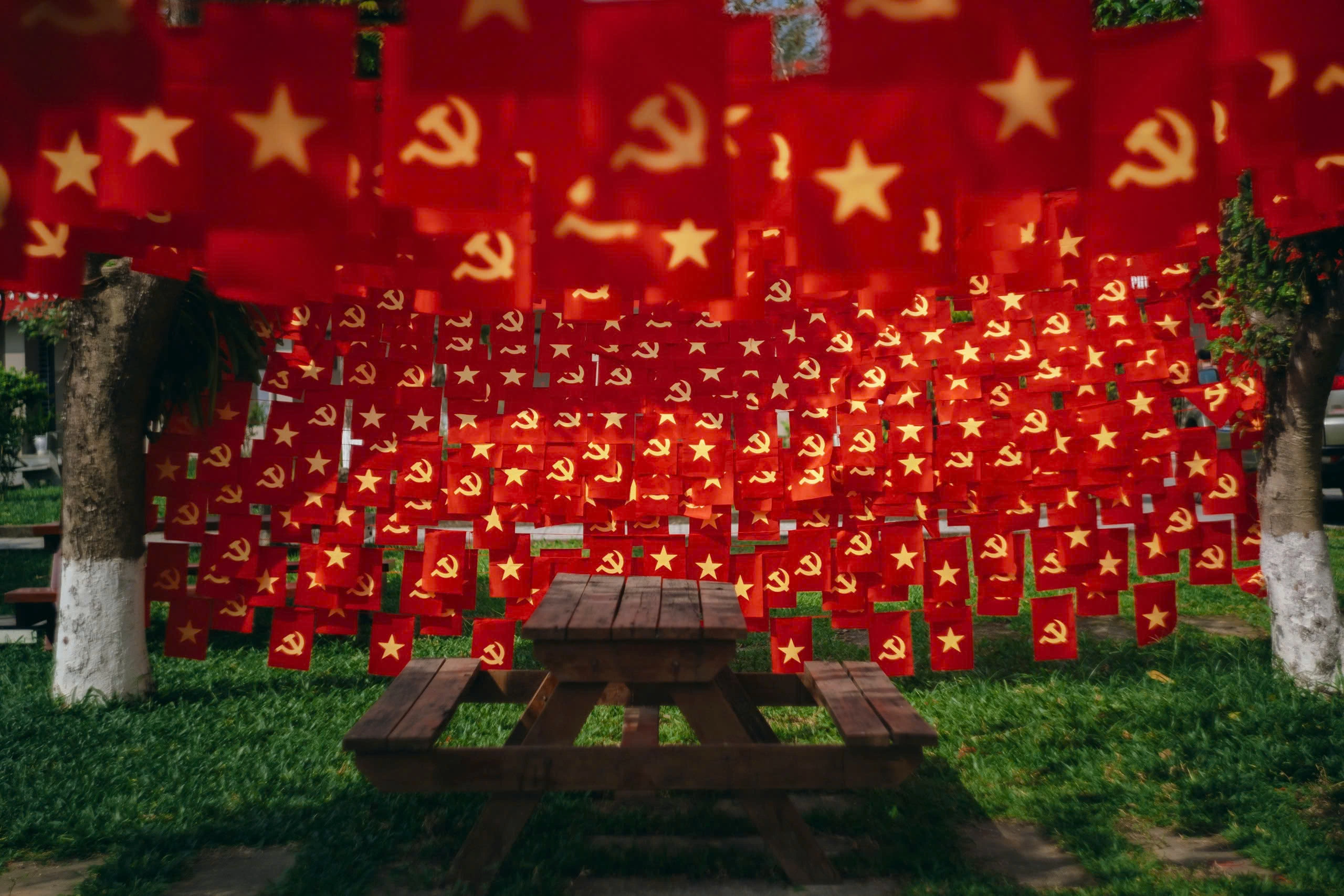 Từ cổng trường đến các dãy giảng đường, đâu đâu cũng tràn ngập sắc đỏ của cờ Tổ quốc và cờ Đảng. Hàng ngàn lá cờ tung bay trong gió, tạo nên một khung cảnh vừa trang trọng, vừa trẻ trung và đầy khí thế.