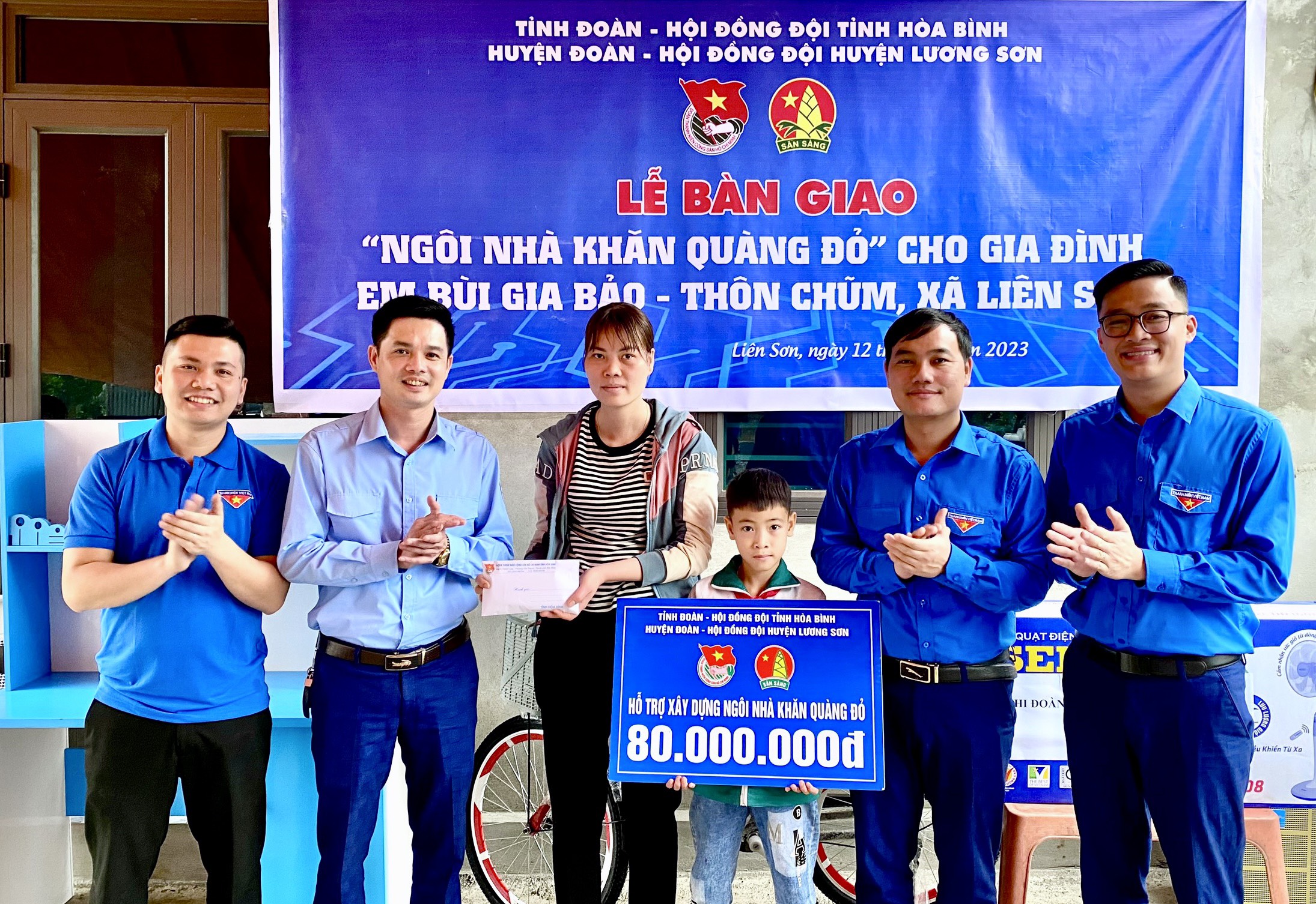 Nhằm kịp thời động viên, sẻ chia những khó khăn với gia đình em Bùi Gia Bảo sớm khắc phục hoàn cảnh khó khăn về nhà ở, Tỉnh Đoàn, Hội đồng đội Tỉnh Hòa Bình đã phối hợp với Quỹ từ thiện Kim Oanh, Công ty Cổ phần đầu tư và phát triển Đức Lợi đồng hành hỗ trợ số tiền 80 triệu đồng để xây dựng “Ngôi nhà Khăn quàng đỏ” dành tặng gia đình em Bùi Gia Bảo. Qua hơn 3 tháng thi công, với sự giúp đỡ của chính quyền địa phương, Đoàn thanh niên xã Liên Sơn và sự nỗ lực của gia đình hiện nay ngôi nhà đã hoàn thiện khang trang sạch, đẹp với diện tích 100m2 và tổng kinh phí gần 200 triệu đồng. Cũng tại chương trình, đại điện Ngân hàng VP Bank - Chi nhánh huyện Lương Sơn trao tặng em Bùi Gia Bảo 01 chiếc xe đạp và 01 chiếc bàn học; Huyện đoàn, Hội đồng Đội huyện Lương Sơn trao tặng gia đình em Bùi Gia Bảo 01 chiếc quạt điện. Phát biểu tại chương trình đồng chí Hoàng Đức Minh - Phó Bí thư Tỉnh đoàn, Chủ tịch Hội đồng đội tỉnh Hòa Bình ân cần động viên gia đình và mong em Bùi Gia Bảo tiếp tục nỗ lực vượt qua hoàn cảnh khó khăn vươn lên trong học tập, tham gia tích cực hoạt động công tác Đội tại nhà trường và địa phương, phấn đấu để trở thành con ngoan, trò giỏi, Đội viên tốt, cháu ngoan Bác Hồ. Đồng thời, đề nghị các cấp, các ban ngành, đoàn thể xã Liên Sơn và Huyện đoàn, Hội đồng Đội huyện Lương Sơn trong thời gian tới tiếp tục quan tâm, hỗ trợ và đồng hành giúp đỡ các em thiếu nhi có hoàn cảnh khó khăn trên địa bàn huyện.